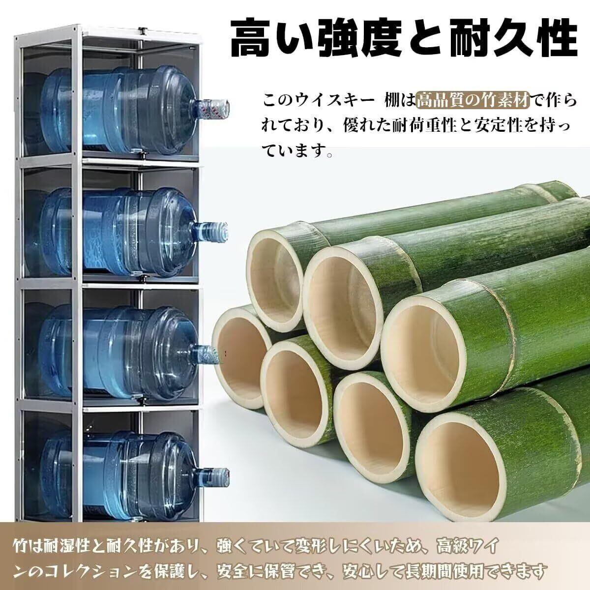 【高い強度と耐久性】このウイスキー 棚は高品質の竹素材で作られており、優れた耐荷重性と安定性を持っています。竹は耐湿性と耐久性があり、強くていて変形しにくいため、高級ワインのコレクションを保護し、安全に保管でき、安心して長期間使用できます。ご注意:サイズ測定では1-3cmの誤差があります。予めご了承ください。
