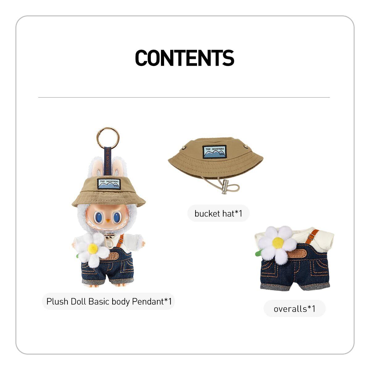 【THE MONSTERS FALL IN WILD ぬいぐるみペンダント】春らしいグレーヘアーに、バケットハットとサロペットのアウトドアスタイル! 少し小さめのLABUBU(ラブブ)を連れてお出かけしよう!