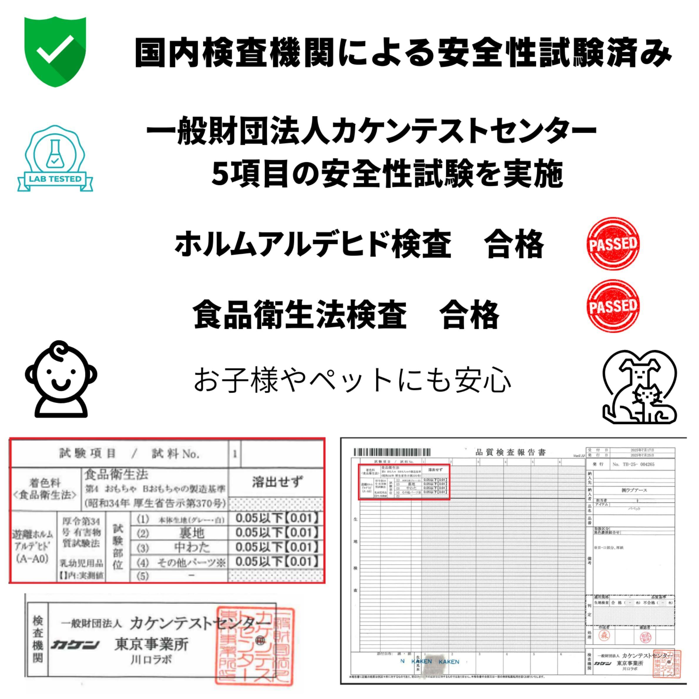 【 国内検査機関で検査済み 】このパペットは、お子さまやペットが毎日安心して遊べるよう、一般財団法人カケンテストセンターにて厳しい品質検査を実施しています。ホルムアルデヒドの検査、食品衛生法に基づいた溶出試験をクリアし、すべての項目で基準値以下であることが確認されています。国内の信頼ある検査機関によって「合格」と判定されたこのパペットは、見た目のかわいらしさだけでなく、見えない部分の安全性にもこだわっています。