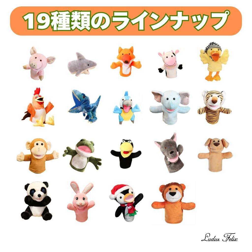 【19種類から選べるバラエティ豊富なキャラクター】青い恐竜/サメ/オウム/黄色いアヒル/カエル/トラ/ピンクのブタ/キツネ/カラス/グレーのオオカミ/イヌ/ウシ/サル/ライオン/ゾウ/ニワトリ/パンダ/ピンクウサギ/クリスマスペンギン、お好きなキャラクターを単品購入可能。保育園・幼稚園、ペットとのコミュニケーションツール、ギフトとしても一度に揃えやすいラインナップです。