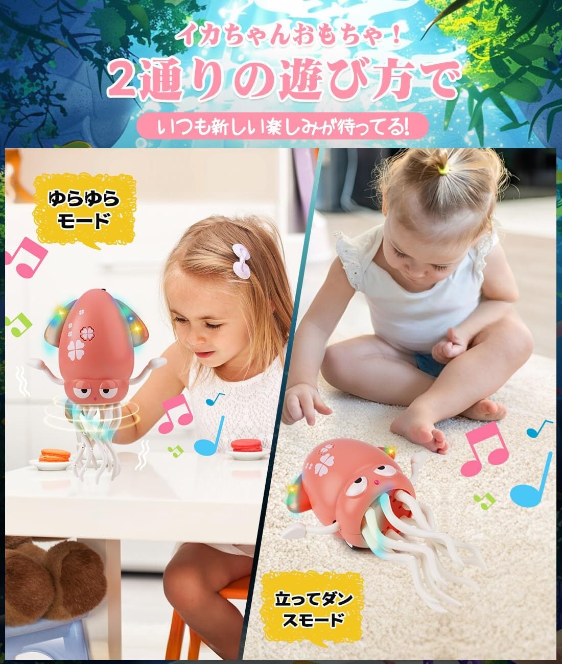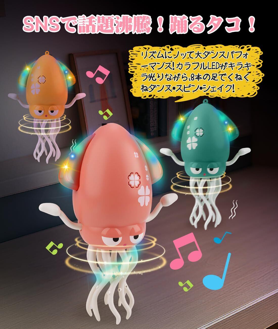 SNSで話題沸騰!リズムにノッて大ダンスパフォーマンス! カラフルLEDがキラキラ光りながら、8本の足でくねくねダンス・スピン・シェイク!まるで生きているような滑らかな動きがとにかく可愛い!音楽に反応してノリノリで踊るから、手を叩いたり声をかけたりして遊べば、即席ダンスパーティーが始まっちゃう!動画撮影必須のSNS映え間違いなし✨
