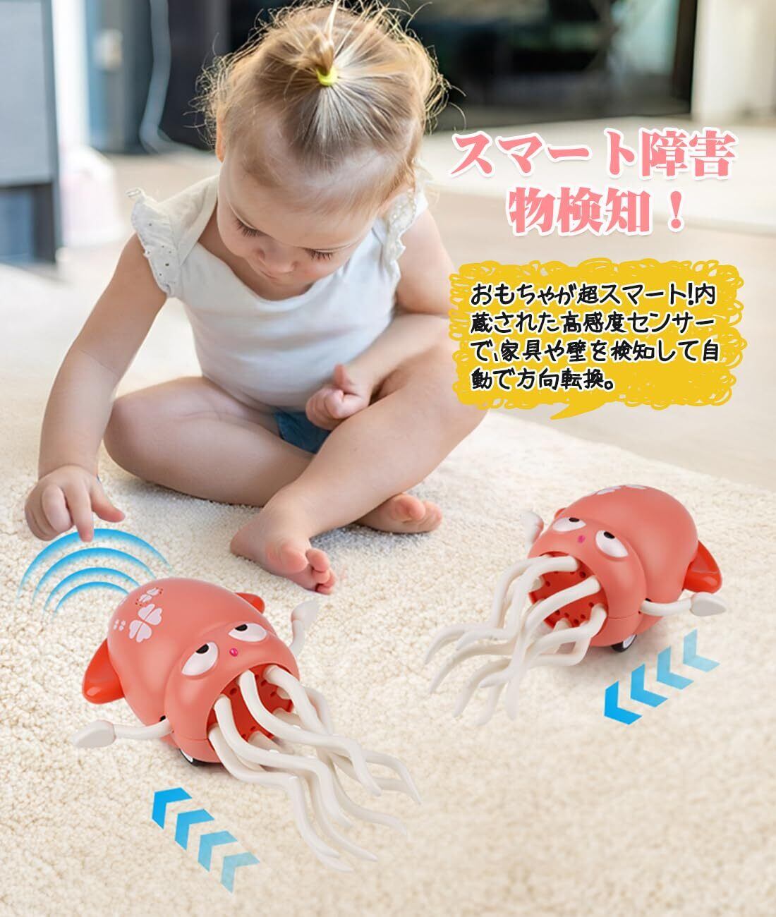 賢いセンサー搭載でお部屋を自由探検!ママもストレスフリー! 内蔵スマートセンサーが家具や壁を自動検知!ぶつからずスルリと方向転換するから、赤ちゃんのそばやペットがいても安心。階段やテーブルから落ちる心配もゼロ!見ているだけで何時間も飽きない、動き回るイカの探検を楽しめます。