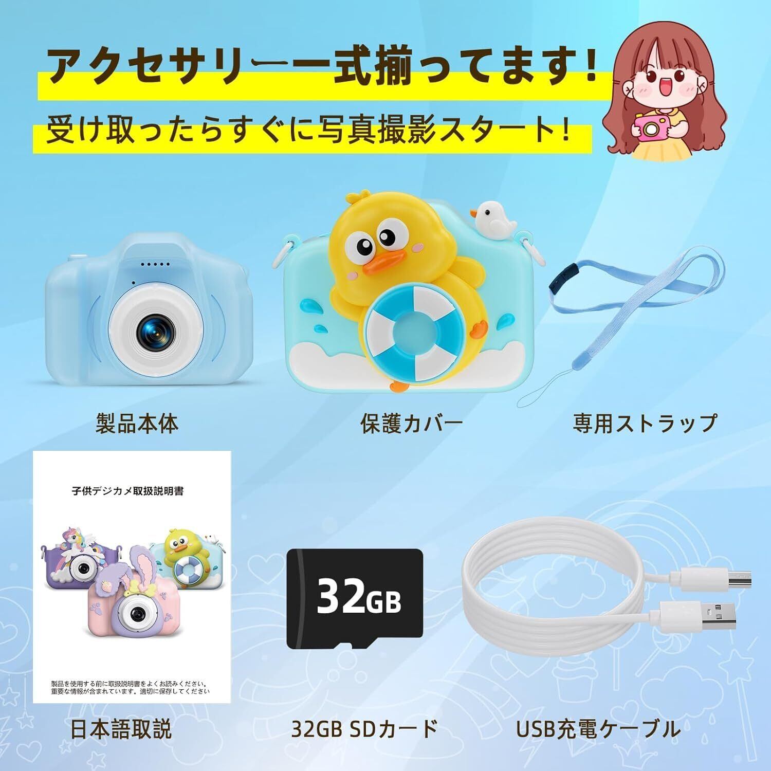 3 歳以上対応 キッズカメラ こども用カメラ 1080P フル HD 動画撮影 32GB 大容量内蔵 4 倍ズーム機能 USB 充電式 デジタルカメラ 自撮り デュアルカメラ 操作簡単 トイカメラ 女の子誕生日プレゼント 子供の日ギフトに最適 クリスマスプレゼント