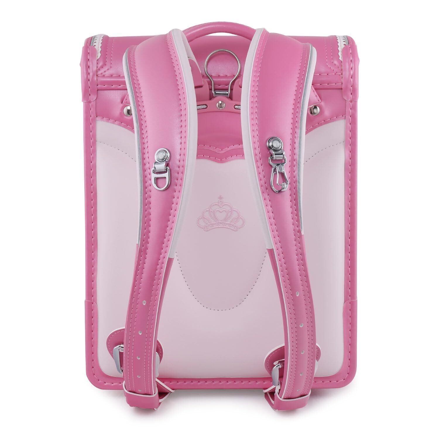 【2026向け】最新女の子向けランドセル、プリンセスモデル、銀色系金具、4色展開(水色/紫色/ピンク/ベージュ)。ランドセルかぶせの両脇に白い透かし模様のレザートリム、もっと細部にこだわり~サイドにマジックミラーの形をした刺繍が施され、少女の形がエンボス加工で表現されている。特殊な銀の反射コーティングが施され、光の中で魔法のように変身する。ファンタジーとおとぎ話でいっぱいのランドセル、可愛いと豪華な気分!