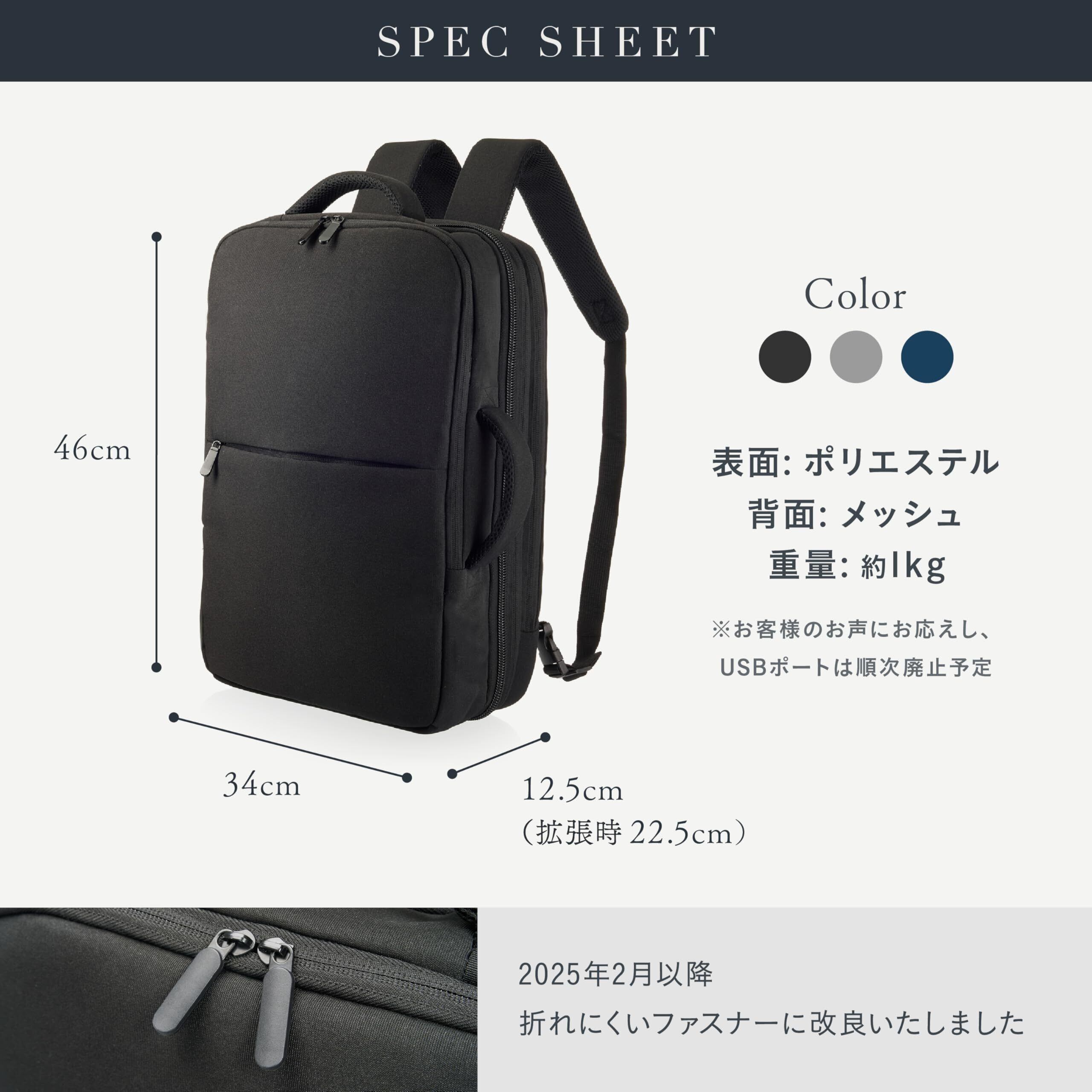 【充実の収納力と機能】 ビジネスマンの必需品に合わせた用途別ポケットが充実。 ・16インチPCまで対応可能なPCポケット(保護クッション付き) ・中には取り出しやすいフリーポケット、貴重品収納に便利なファスナー付きポケットを完備 ・前面には、必要なものをさっと取り出せるフロントポケットあり ノートPCから細かいものまで、これ1つで整理整頓が叶います。 また、マチが12.5cmから22.5cmに拡張可能なため、 荷物が多い日や出張時などもこれひとつでOK。移動を考え、機内持ち込みにも便利なキャリーオン機能を搭載。旅行などでも活躍すること間違いなしです。