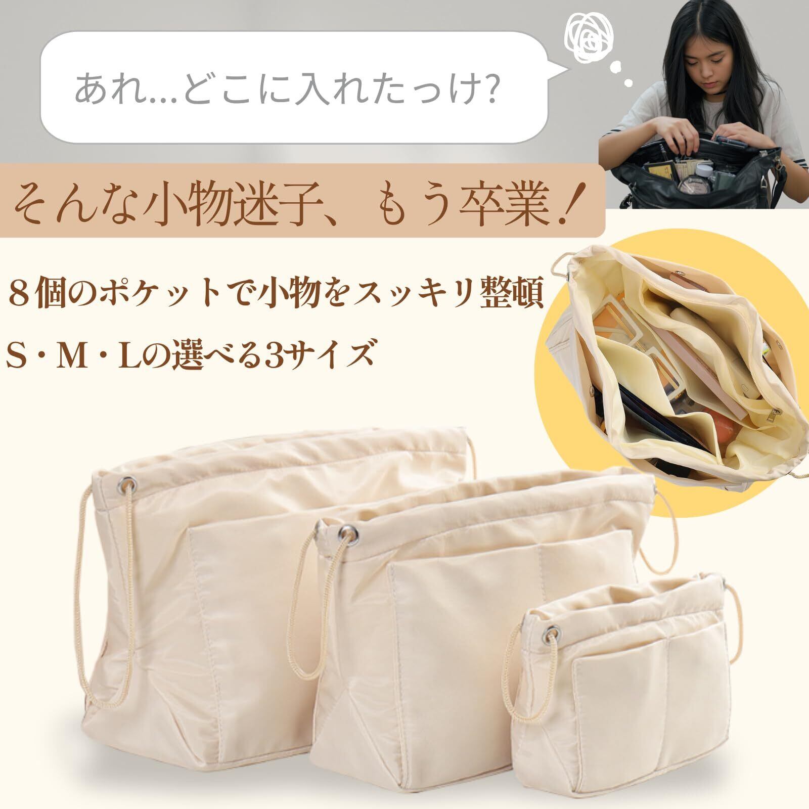 [三八商店] バッグインバッグ 【3サイズ展開 S/M/L】 自立 バックインバック インナーバッグ 小さめ 縦型 巾着 バッグ インバック バッグイン 文房具 収納 バック イン a4 軽量 型崩れ防止 詰め物 トートバッグ用 仕切り 整理整頓