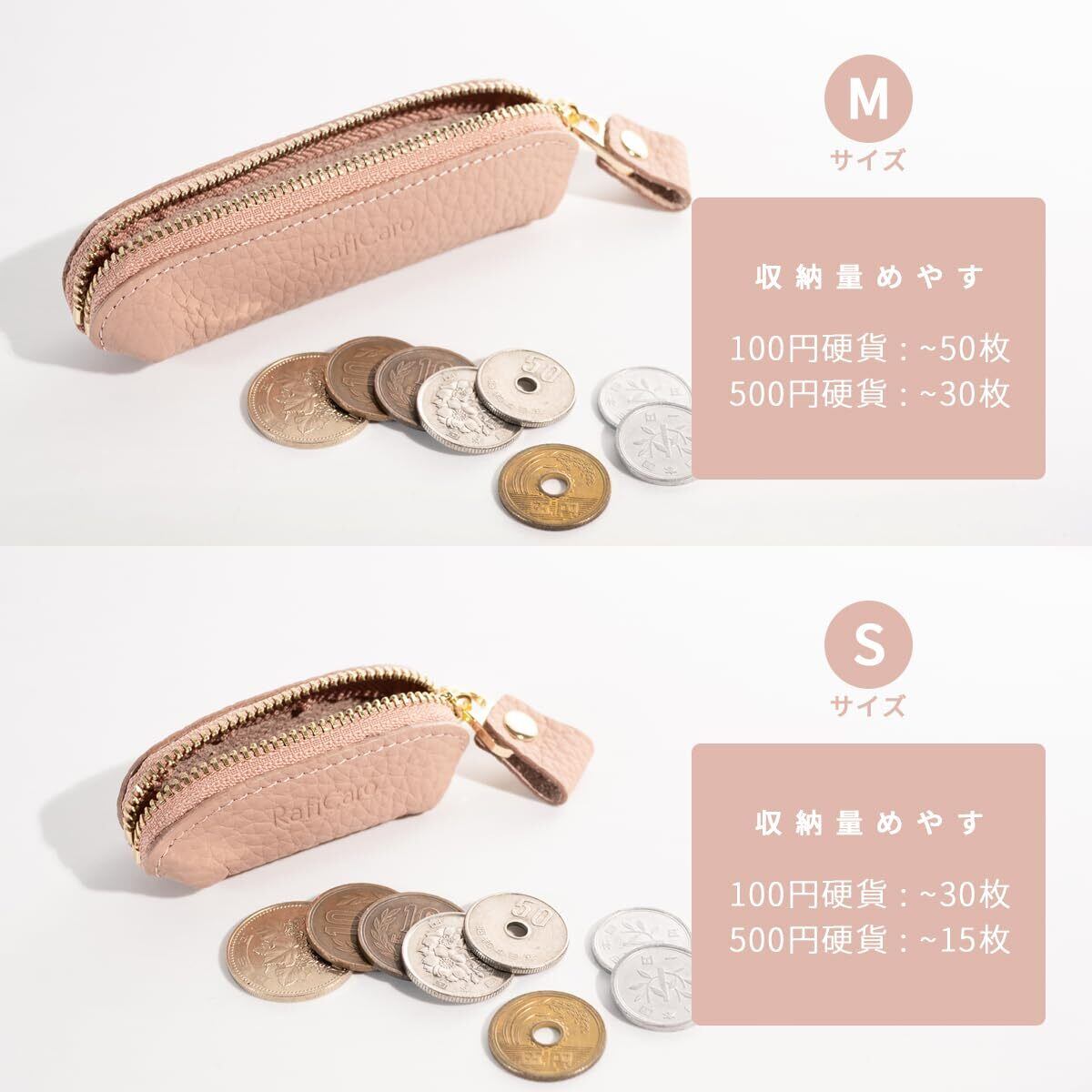 【収納目安】 ・Mサイズ 1円~100円硬貨:50枚程度 500円硬貨:30枚程度 ・Sサイズ 1円~100円硬貨:30枚程度 500円硬貨:15枚程度 【サイズ】 ・Mサイズ 縦 30mm × 横 120mm × 厚み 28mm 重さ 19g ・Sサイズ 縦 30mm × 横 75mm × 厚み 28mm 重さ 15g 【素材】 ・本革 シュリンクレザー