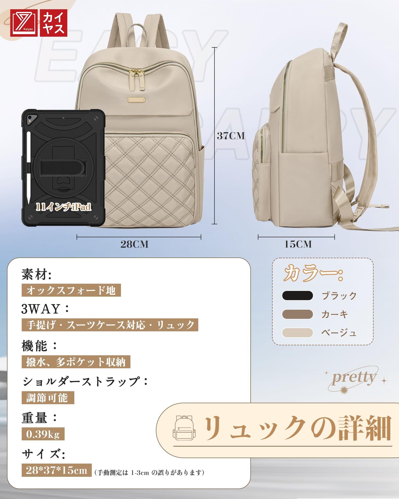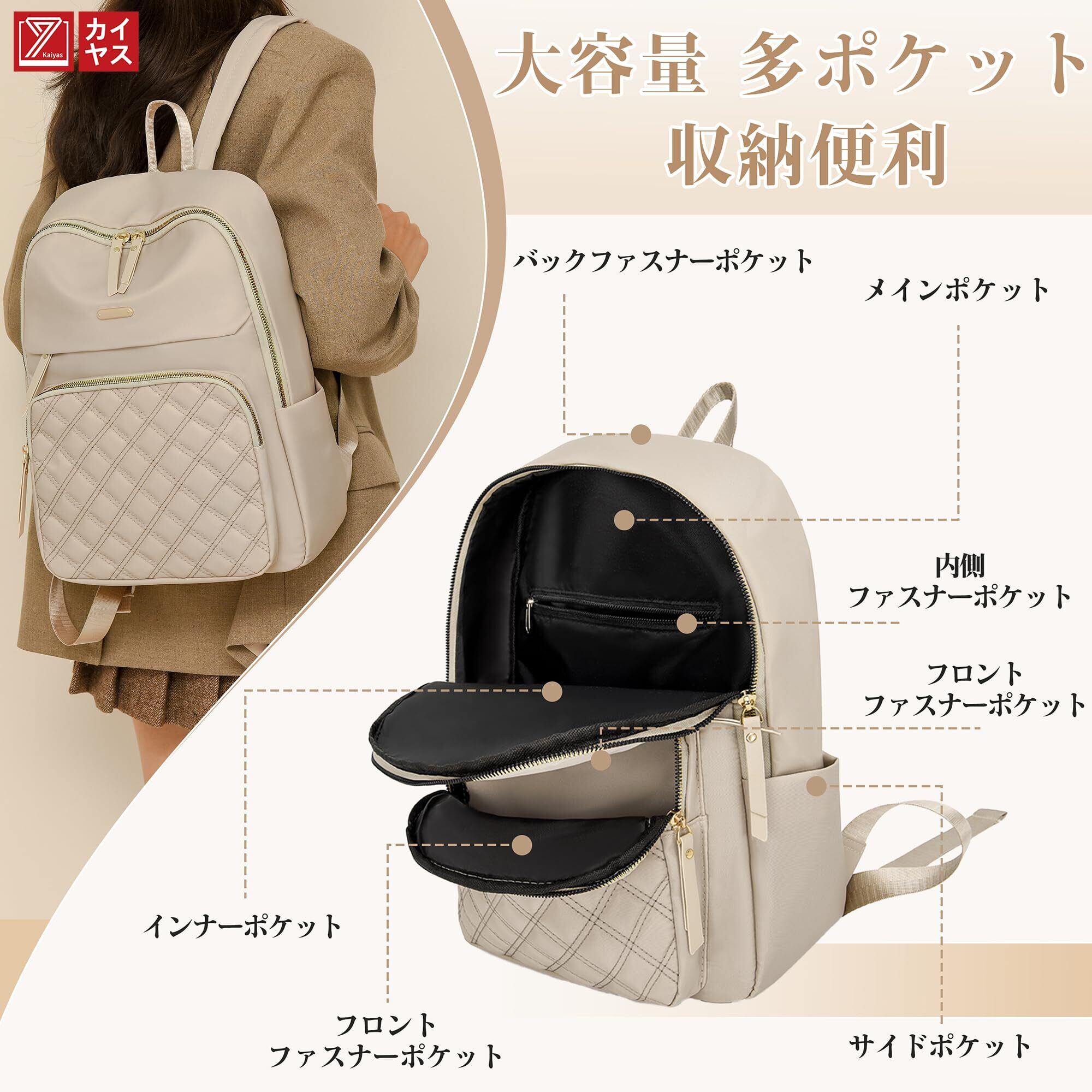 多収納ポケット:バックパックサイズ:幅24高さ33厚さ11cm、バックパックには複数のポケットデザインがあり、フロント部分には三つの小さなファスナーポケットがあり、口紅、バスカード、鍵など小物を収納できます。 大容量メインルームは11インチipad、雑誌、水筒、財布、ミニポーチなど内部に、小さなファスナーポケットと小さな口を入れることができます。 サイドポケット、小さな傘とコップが収納できます;後ろファスナー付きの小さなポケット、携帯電話、クレジットカード等の重要な物を入れることができます。 お出かけにはこれ1つで十分です。
