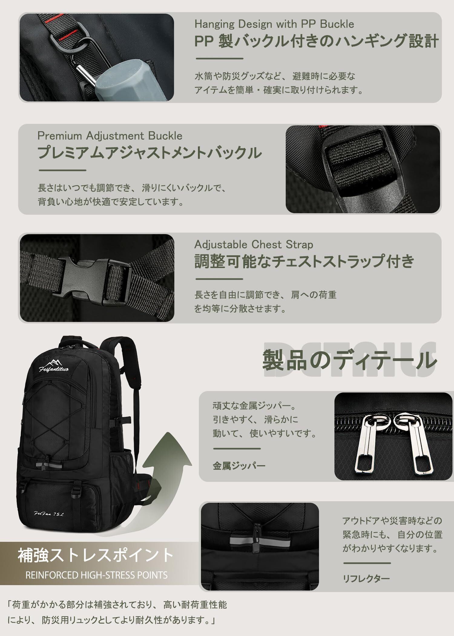 【金属ジッパー・リフレクター】金属ジッパー:頑丈な金属製ジッパーを採用。引き手が大きく、スムーズに開閉でき、耐久性にも優れています。PP製バックル付きのハンギング設計:水筒や防災グッズなど、避難時に必要なアイテムを簡単かつ確実に取り付けることが可能です。リフレクター:アウトドアや災害時などの暗所や視界不良の状況でも、自分の位置を周囲に知らせるため、安全性が高まります。調節可能なチェストストラップ付き:胸ベルトの長さを自由に調節でき、肩への荷重を均等に分散。ずれにくく、長時間の使用でも快適です。