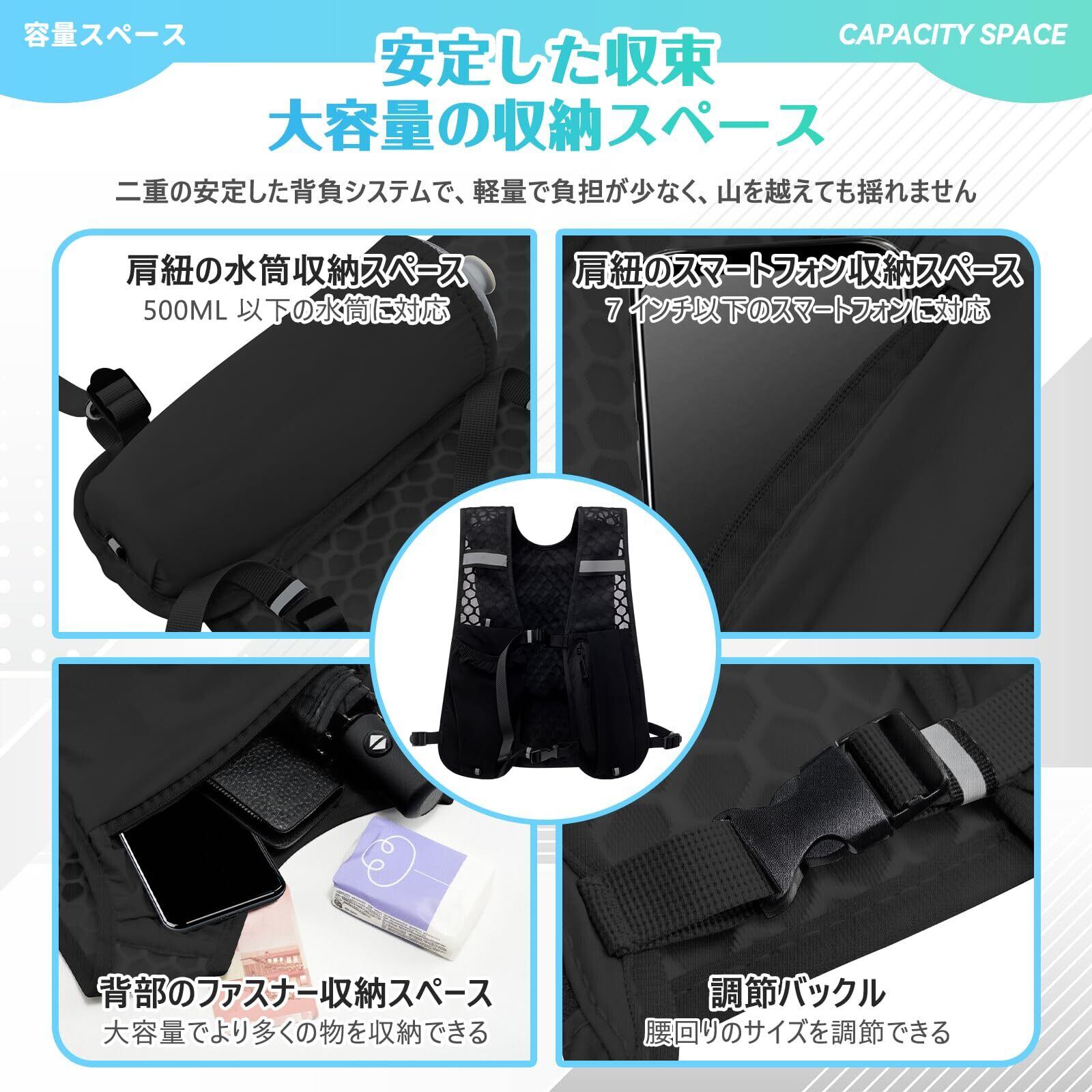 【多用途の水分補給と携帯電話収納】: この軽量スポーツバックパックには、最大500mlのウォーターボトル専用のコンパートメントと、7インチのデバイスを収納できる携帯電話収納ポケットが付いており、アウトドア活動中に水分補給と接続を確保します。