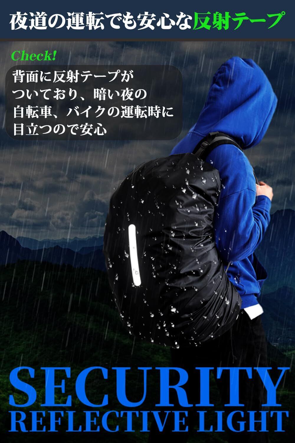 【高い防水性】専門機関が定めた耐水性の試験をクリアした防水リュックカバー。高性能な210Tナイロン生地を採用し、耐水厚1500ミリと言う高い防水性能を実現しました。しっかりと雨を弾き、バッグや中身が濡れるのを防ぎます。