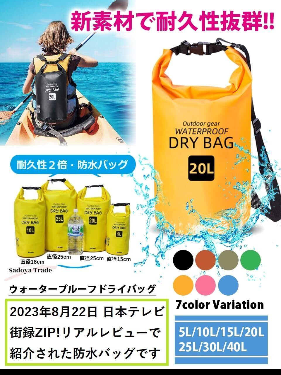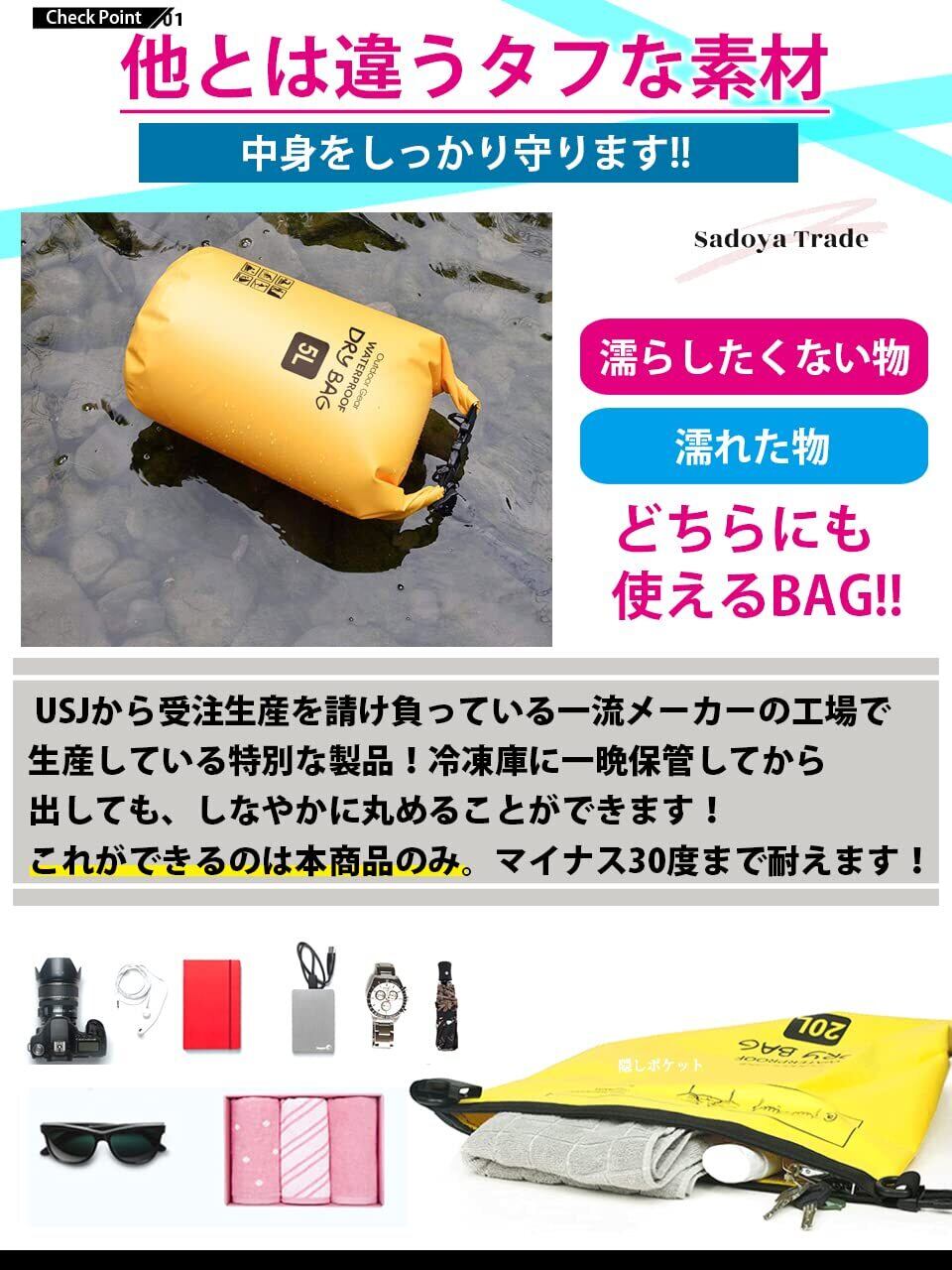 1【長持ちするドライバッグ】【 冬でも柔らかな素材 】夏でも冬でも、海でも山でも、一年中タフに使える2年間付きのしなやか防水バッグ・ドライバッグです。0.5mmの厚みの第4世代素材「Ultra-Soft Coating 500D PVC Tarpaulin」を採用。 耐久性と防水性を高めるためにダブルステッチ再成形シール付きシーム加工ですき間からの水の侵入を完全に阻止。耐久性と柔軟性を兼ね備えた商品。 ー30℃~70℃までしなやかさを確保。 耐久年数2年間という堅牢さを実現。 ヘビーデューティに防水バッグをお使い頂きたい方には最適な商品です。 本商品は、雨、雪、ほこり、砂に対してお客様の荷物を安全にドライに保ちます。【サイズ豊富】5L、10L、15L、20L、25L、30L、35L、40L _ _
