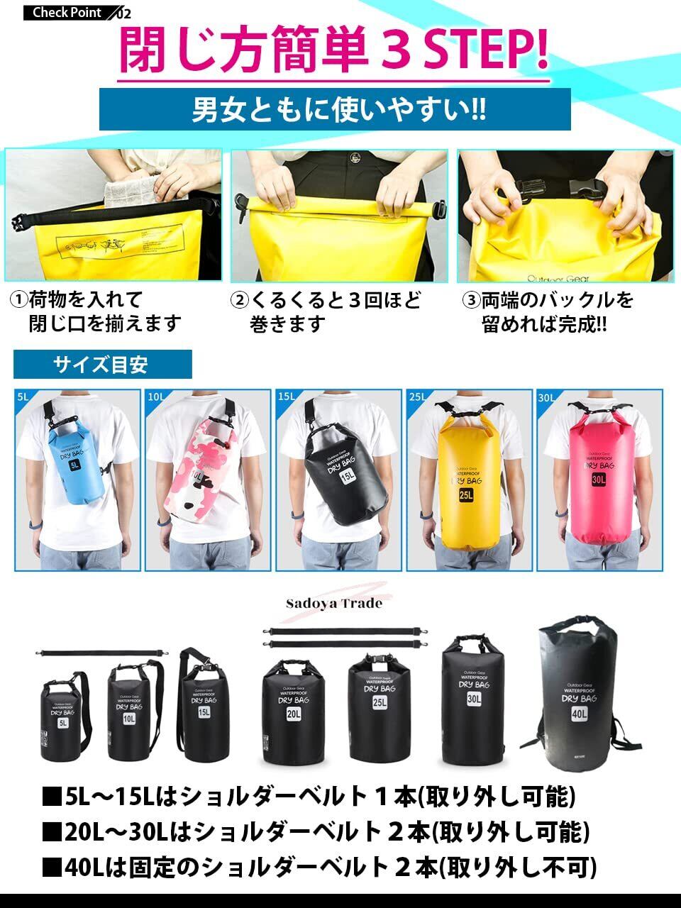 本商品は耐久性と防水性を高めるためにダブルステッチの再成形シール付きシーム加工を実施。さらにロールトップ・プラスチック・クロージャーシステムにより入り口からの浸水に対して安全性と防水性を確保。プラスチック・クロージャーとショルダーストラップの留め具は軽量性と頑健化を実現。高密度ナイロン製で調節可能なショルダーストラップは簡単に長さ調整が可能であなたの体にジャストフィットします。5Lと10Lタイプにはワンショルダーストラップが、20L、30Lにはデュアルショルダーストラップが付属。ワンショルダーで斜め掛け、ダブルショルダーでバックパックスタイルの2wayでの利用が可能。