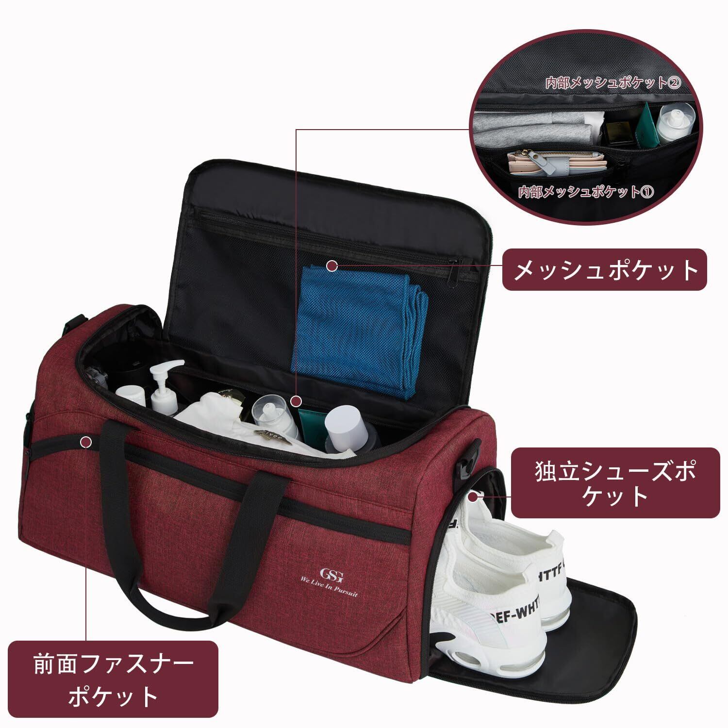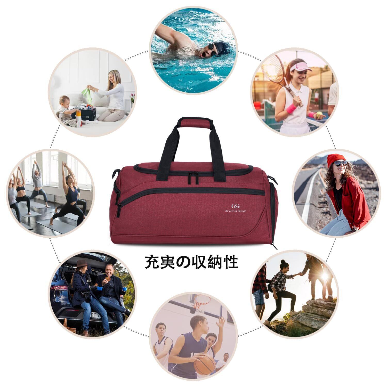 【シューズ収納&乾湿分離付きボストンバッグ】:サイズ:50*28*25CM(縦*幅*高さ)、容量は35Lです;防水ポケットには濡れたタオルや洗面用具などを別に収納できます。靴専用収納ポケットを設け、シューズを分けて収納。運動後の臭いも気にならず、ほかの荷物を清潔に保ちます。