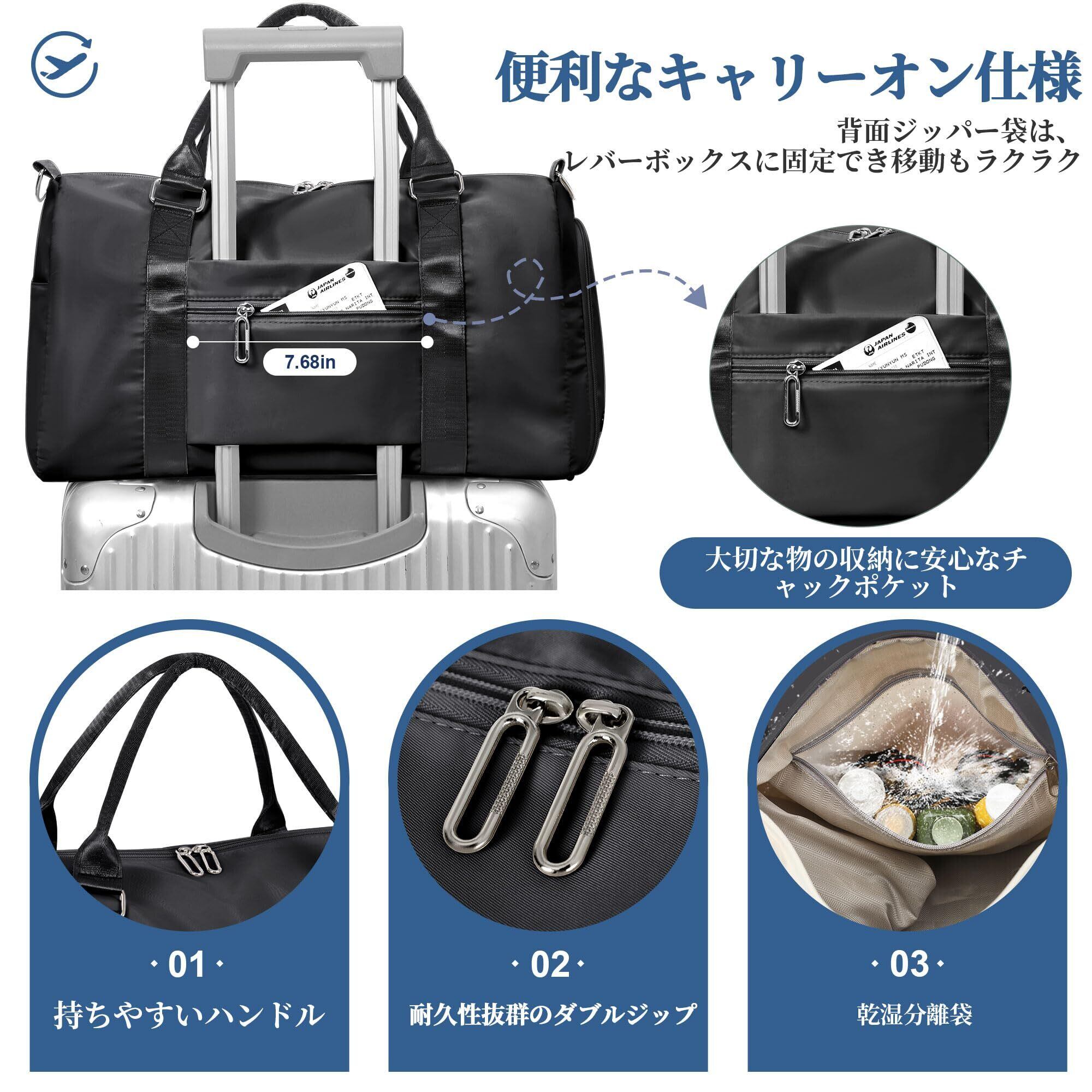 【機内持ち込み対応のトラベルバッグ】:サイズは45x28x20cm(約25L)で、機内持ち込みに最適。背面にはトロリーケース用ストラップを装備し、旅行中の移動が楽々です。【4WAY使い方】:手提げバッグ、ショルダーバッグ、斜め掛け、スーツケース固定
