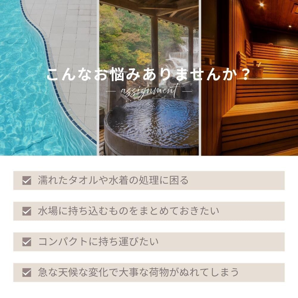【防水性抜群!】水に強い防水素材でサウナやプール、雨天での使用も可能。濡れた服や水着、タオルもご使用いただけます