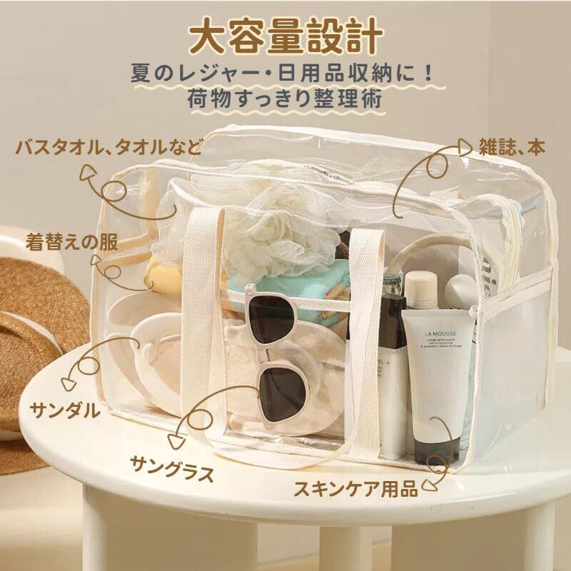 【使い勝手の良さ】透明デザインで中身が一目瞭然、必要な物をサッと取り出せます。大型ファスナー開口部と肩に優しい幅広ハンドル設計で、収納・持ち運びが快適。汚れた時はウェットティッシュで簡単お手入れ可能な清潔仕様。