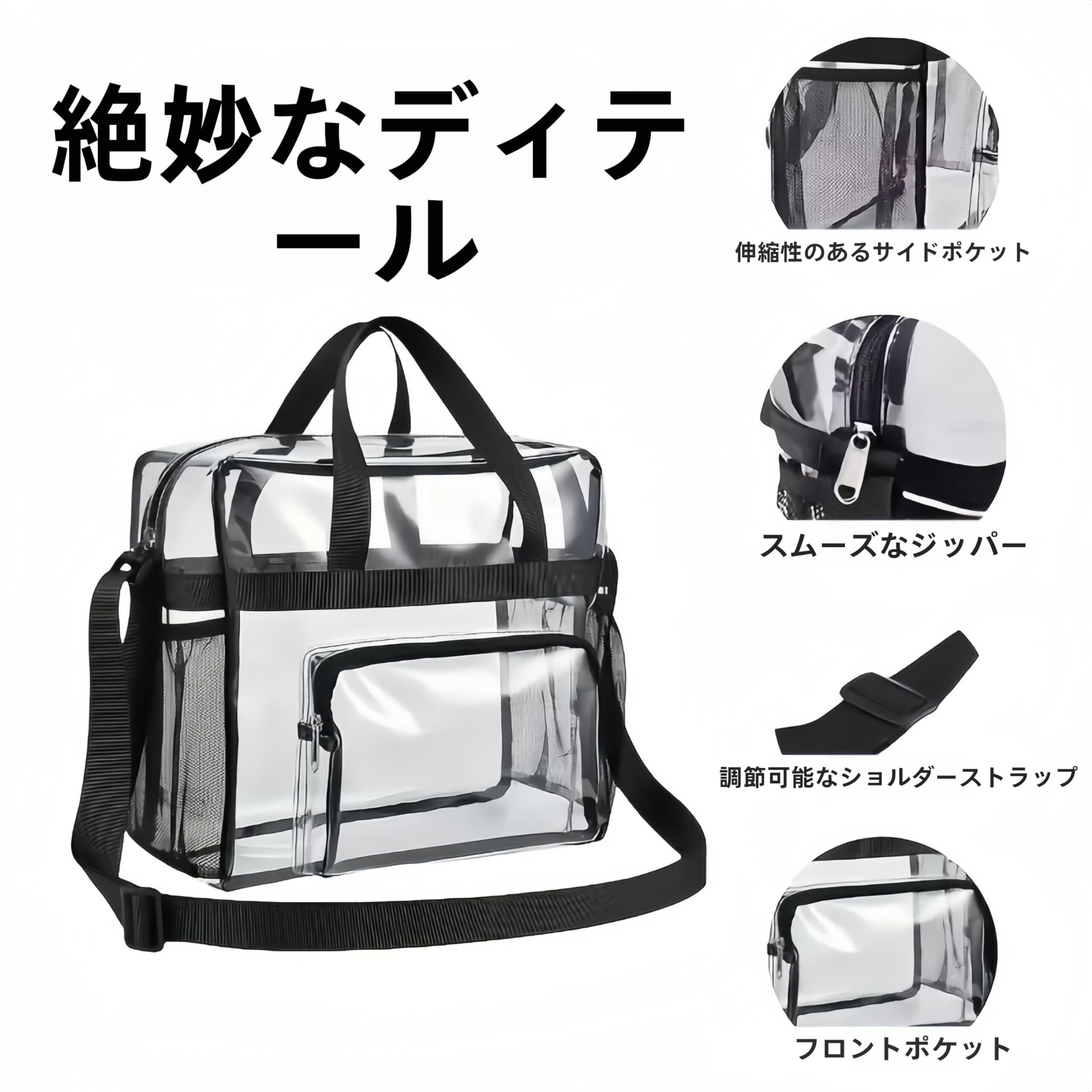 【多场景快速通行】このPVC透明トートバッグは、スタジアムやコンサート会場の厳しい入場規格に対応。透明設計で手荷物検査がスムーズに。スポーツ観戦から旅行、日常使いまで、あらゆるシーンでスピーディーな入場を実現します。大切なアイテムを整理したまま提示できるので、ストレスフリーな体験を。