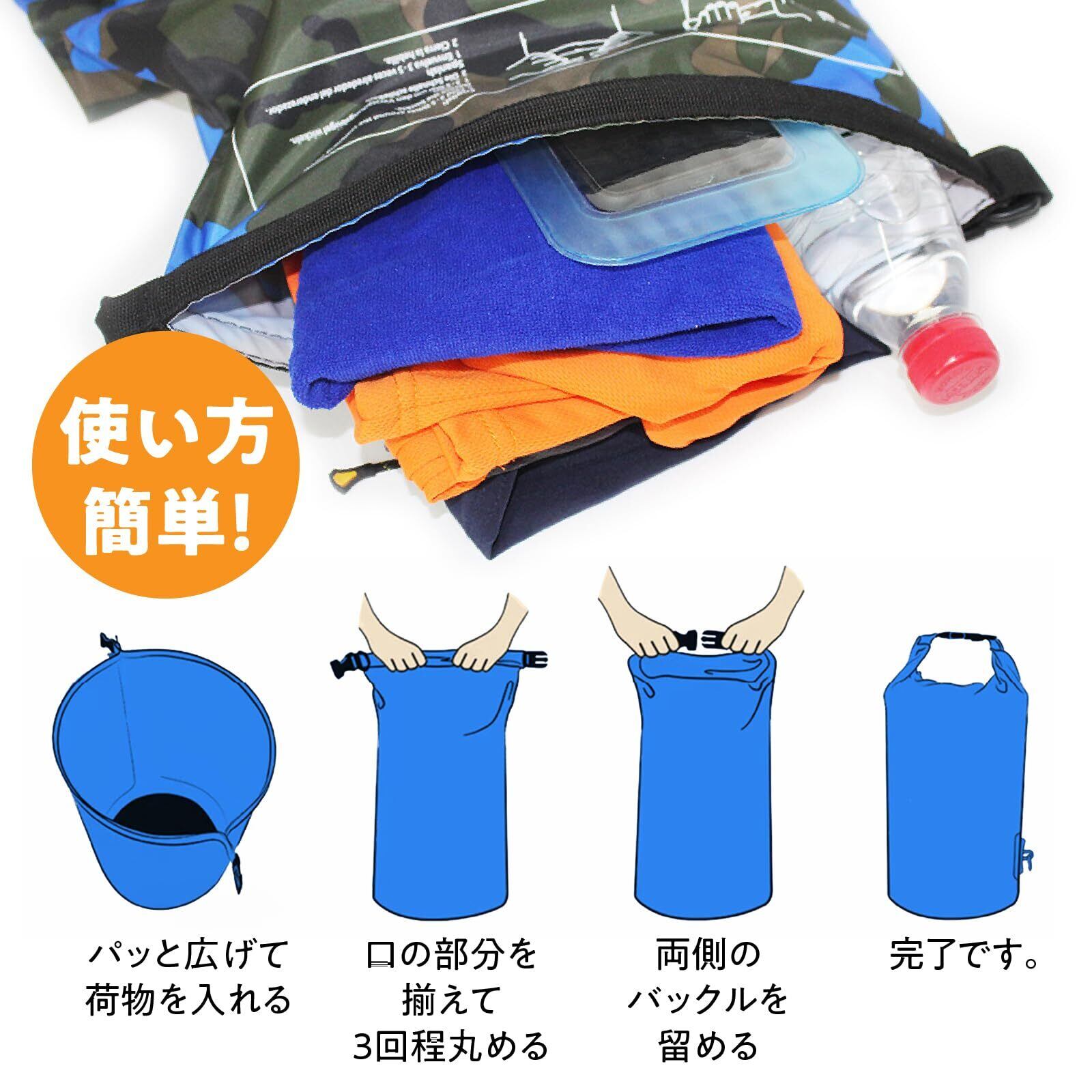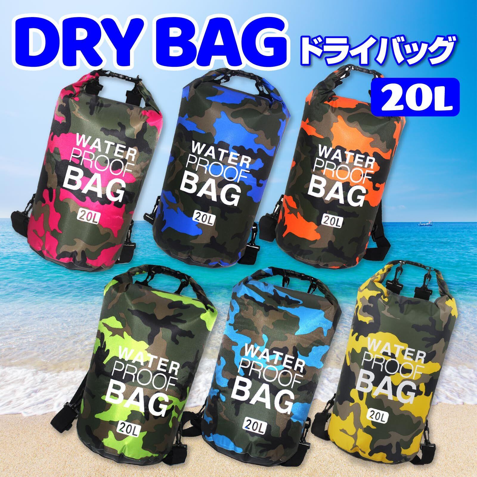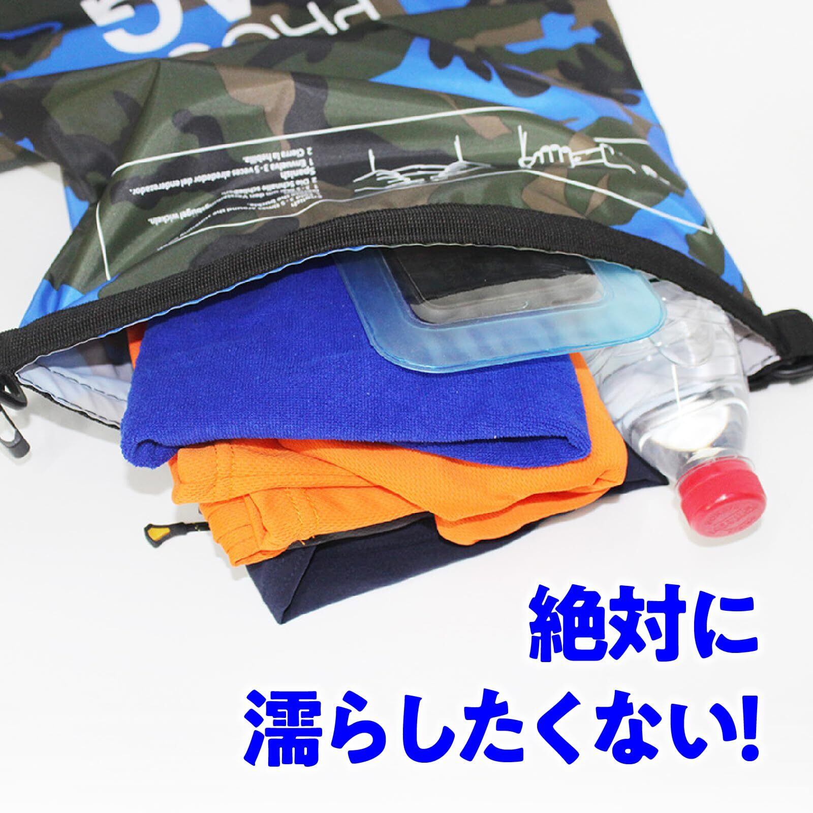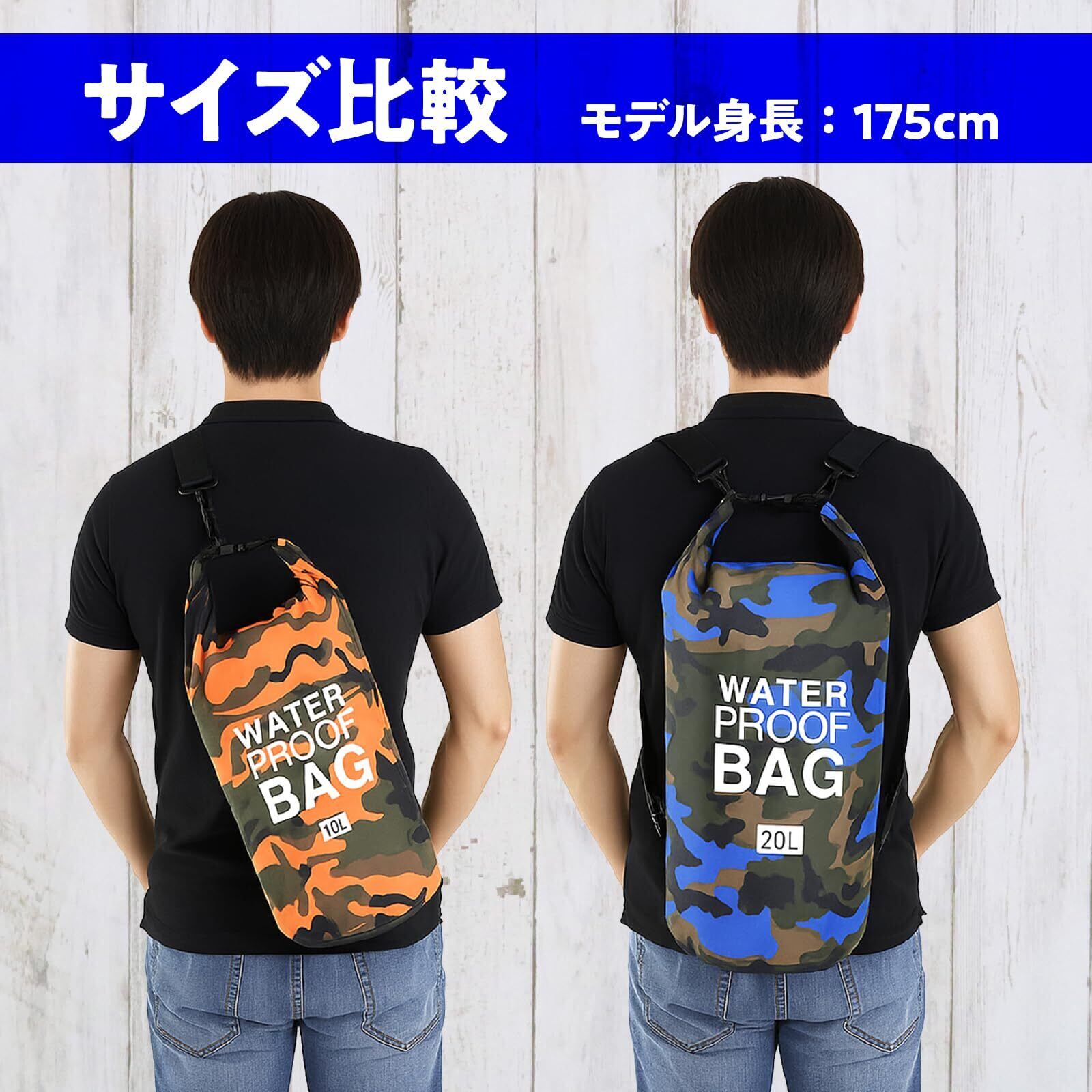 【 使いやすい2サイズ&デザイン 】 10Lは財布やタオルなどの小物収納に最適で、プールやビーチ、ジムなどにぴったり。20Lはリュックスタイルとしても使用でき、キャンプ・釣り・ツーリング・防災用にもおすすめ。さらに、迷彩柄デザインがアウトドアシーンに映えるスタイリッシュな印象を演出します。