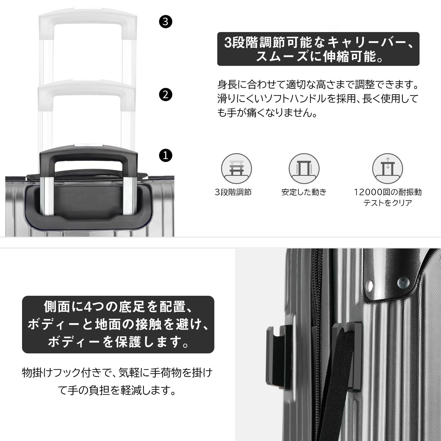 【静音キャスター&調節可能なキャリーバー】キャリーケースは三段階調節なアルミ合金制キャリーバーを採用し、スムーズに伸縮可能。TPE素材で作られた静音キャスターが走行中の振動を軽減し、高耐摩耗性、静音性を実現しながら、360°自由に回転可能。後ろの2個のキャスターにストッパー付き、傾斜のある地面でも簡単にキャスターの動きを止められ、移動中のストレスを軽減。