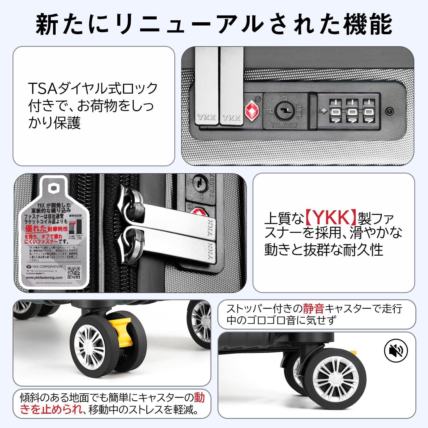 【YKK製ファスナー&TSAダイヤル式ロック】スーツケースのファスナーは【YKK】製ファスナーを採用し、滑やかな動きと抜群の耐久性を発揮。(製品に【YKK】制のタグが付いています。)TSAダイヤル式ロック付きでより安全、安心してご利用いただけます。※鍵穴が航空会社の検査専用の物で本製品は鍵が付属しておりません。