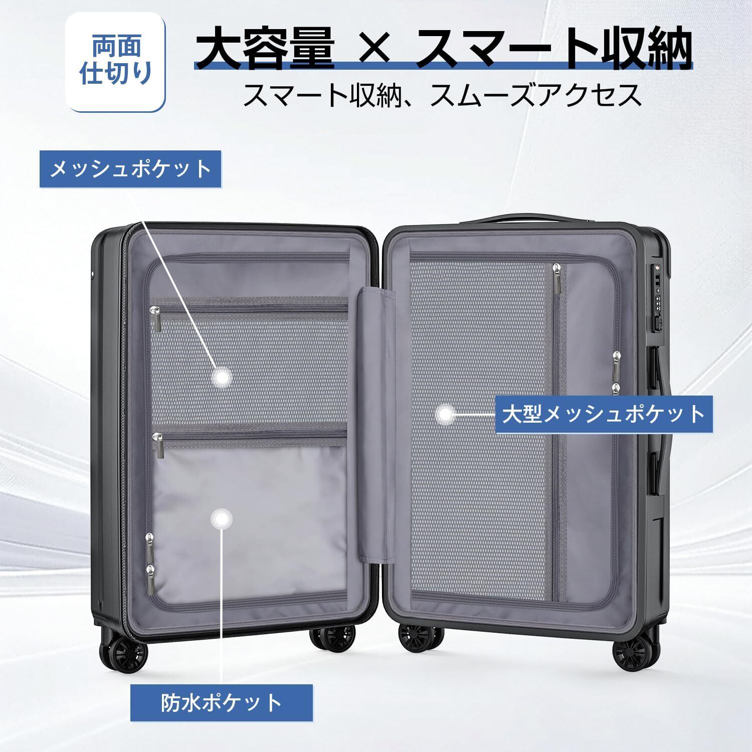 【大容量収納|整理しやすいキャリーケース構造】 内部スペースを最大限に活かした大容量スーツケースで、衣類・靴・小物をスマートに整理できます。仕切りポケットを備えた構造により、荷物を用途別に分けて収納しやすく、出張から家族旅行、入院準備まで幅広いシーンに対応。荷物が多い場合でもすっきり収まり、移動中も中身が見やすい設計です。機能的で整理しやすい構造が、快適な旅をサポートする高性能キャリーバッグです。
