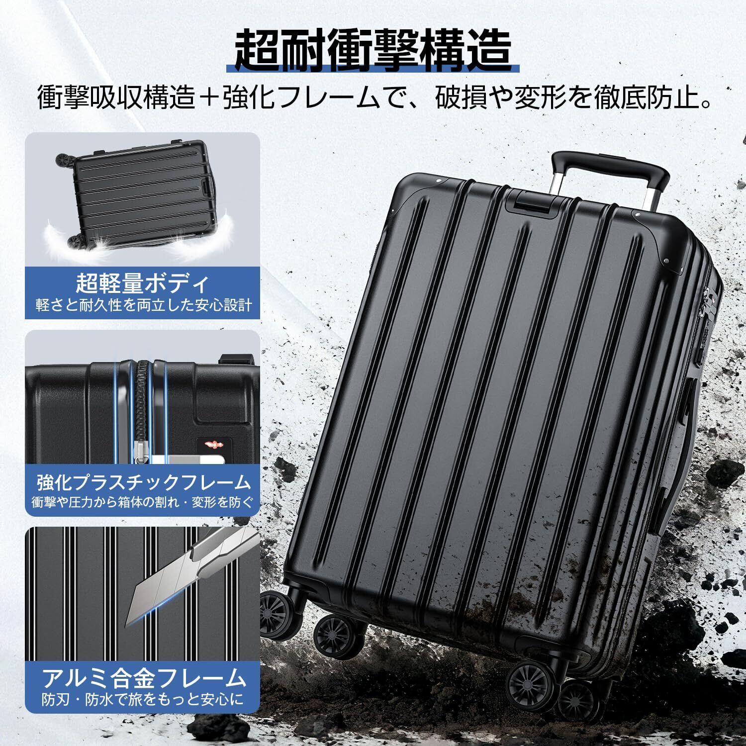 【PC+ABS素材採用|耐衝撃&超軽量スーツケース】このスーツケースは、航空機材にも使われるPC+ABS素材を採用し、超軽量ながら優れた耐衝撃性を実現。移動中の衝突や落下にも強く、外装コーナーには金属プロテクター付きでさらに強度アップ。頻繁に旅行する方でも長く安心して使える、信頼性の高いキャリーケースです。頑丈でありながら洗練された外観は、使い勝手とデザイン性を両立した理想のキャリーバッグとなっています。