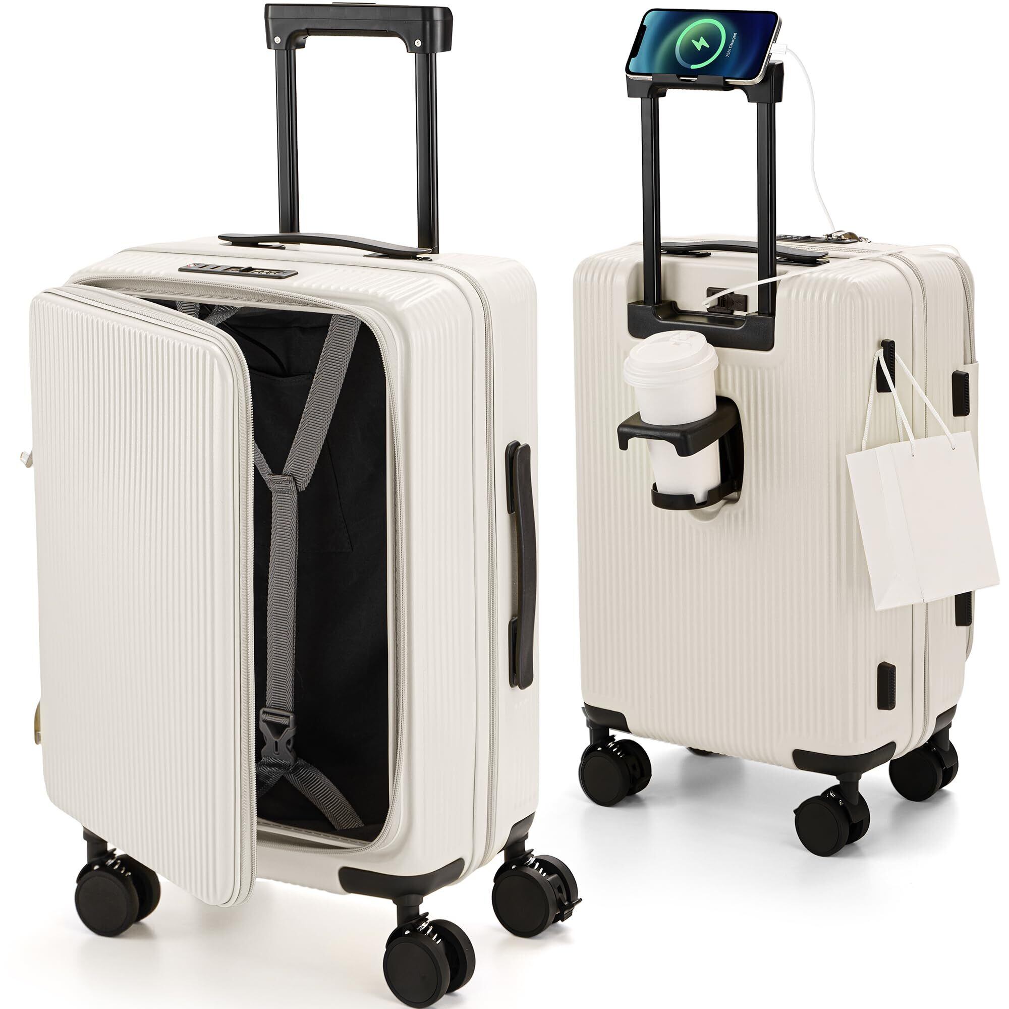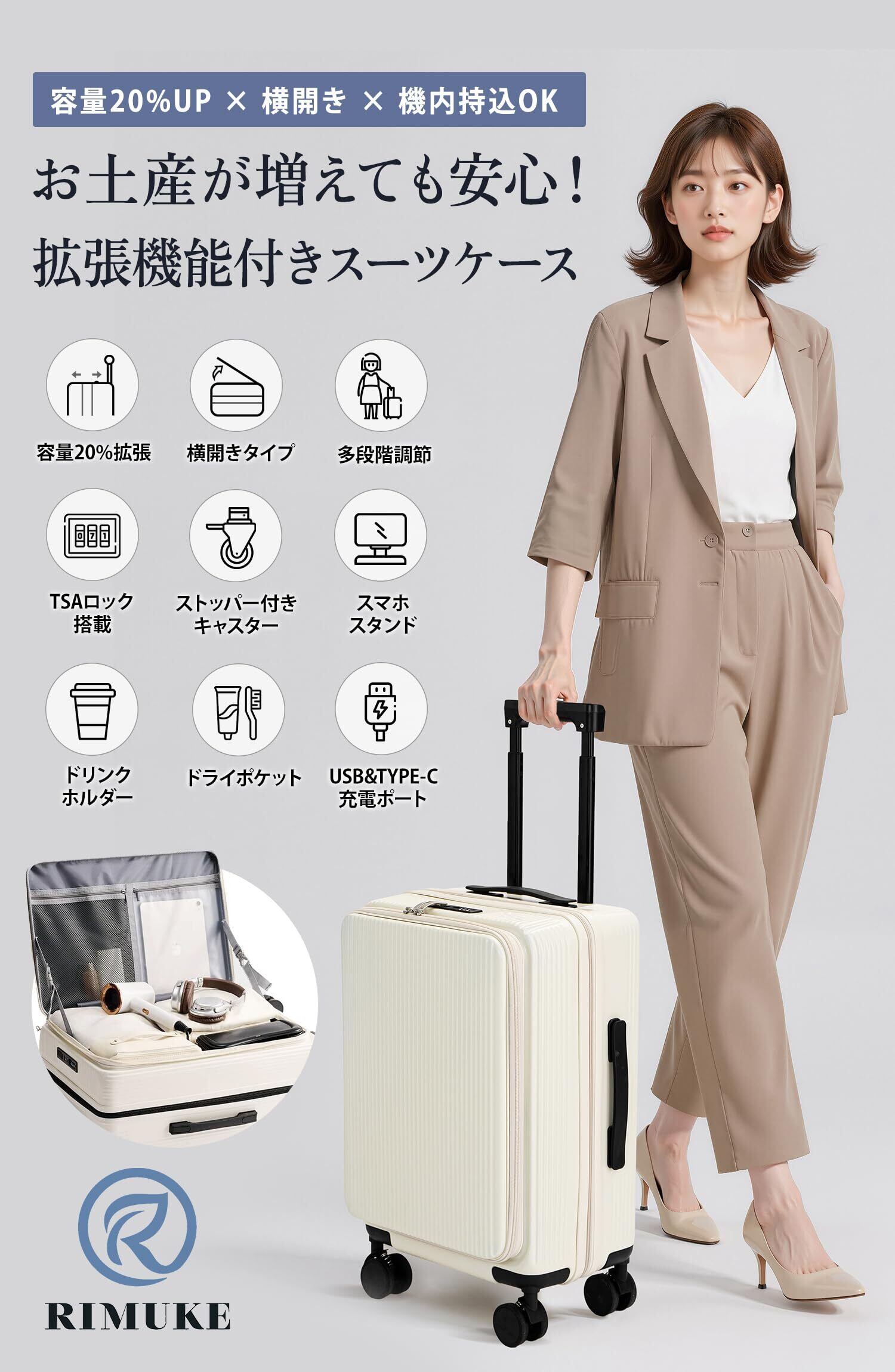 [RIMUKE] スーツケース 機内持ち込み キャリーケース 多機能 片開き 拡張機能付き キャリーバッグ フロントオープン USBポート付き カップホルダー付き 隠しフック機能 超軽量 耐衝撃 静音 360度回転 大容量 TSAロック搭載 旅行 ビジネス 出張 Sサイズ ホワイト