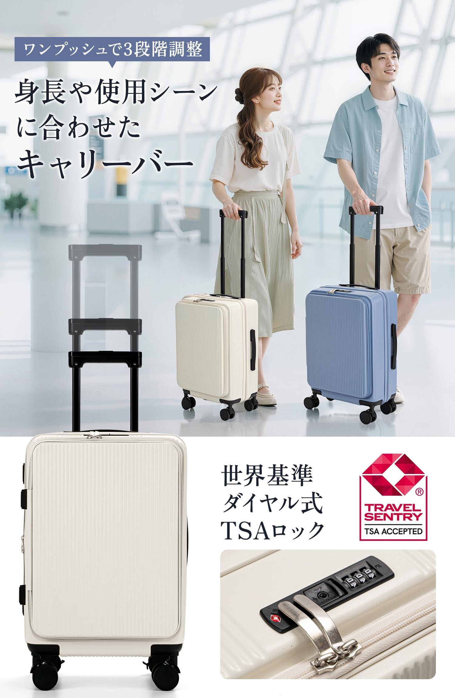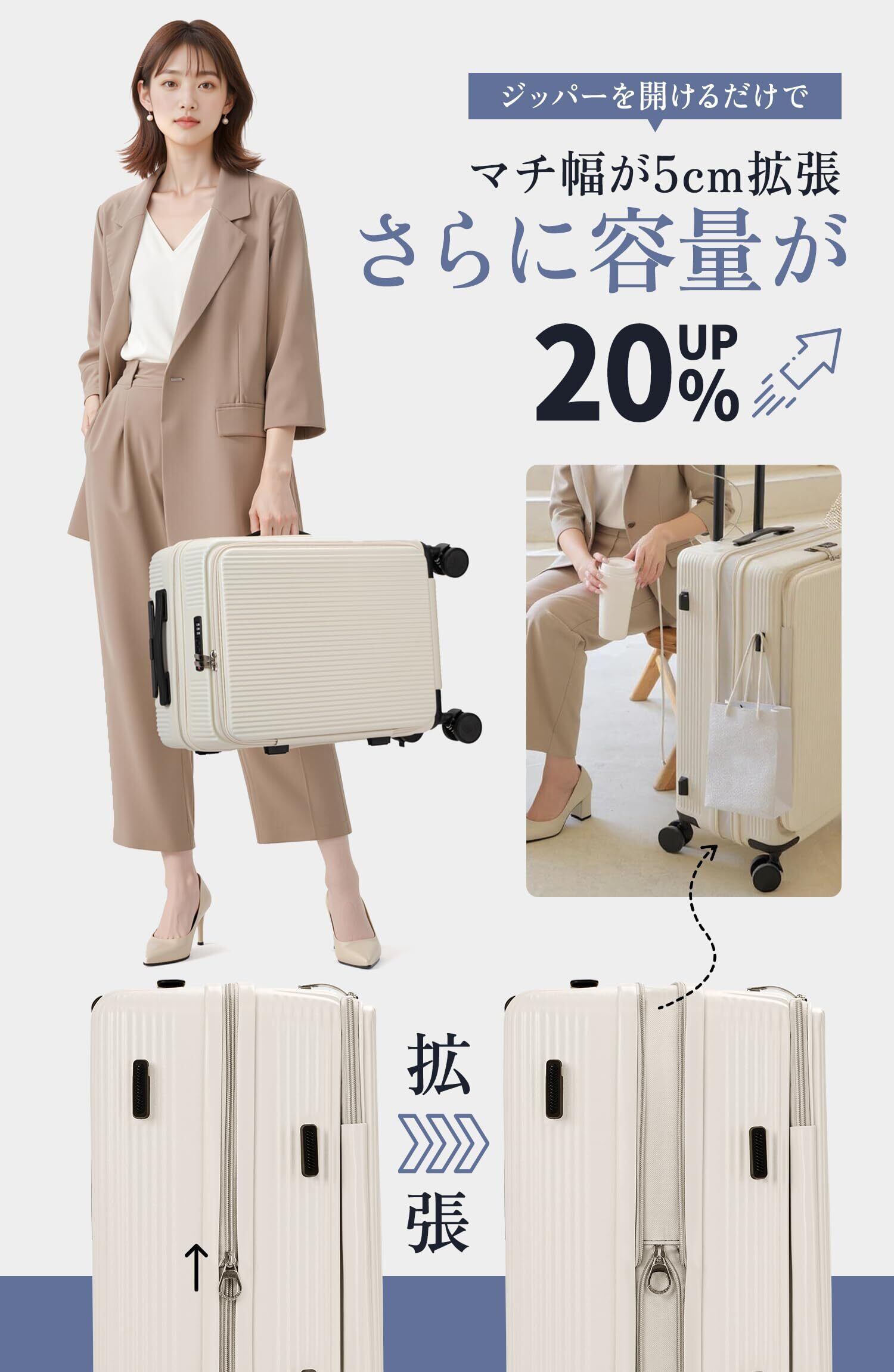 二.【スーツケース 機内持ち込み・片開き・拡張可能・大容量タイプ】片面開きなので狭い場所でも完全に開けずに出し入れが可能で、占有スペースを50%削減します、開けるときも片手で楽々。ファスナータイプで、マチ幅を5cm拡張するだけで容量が20%UPできる。※拡張時は機内持ち込み不可。