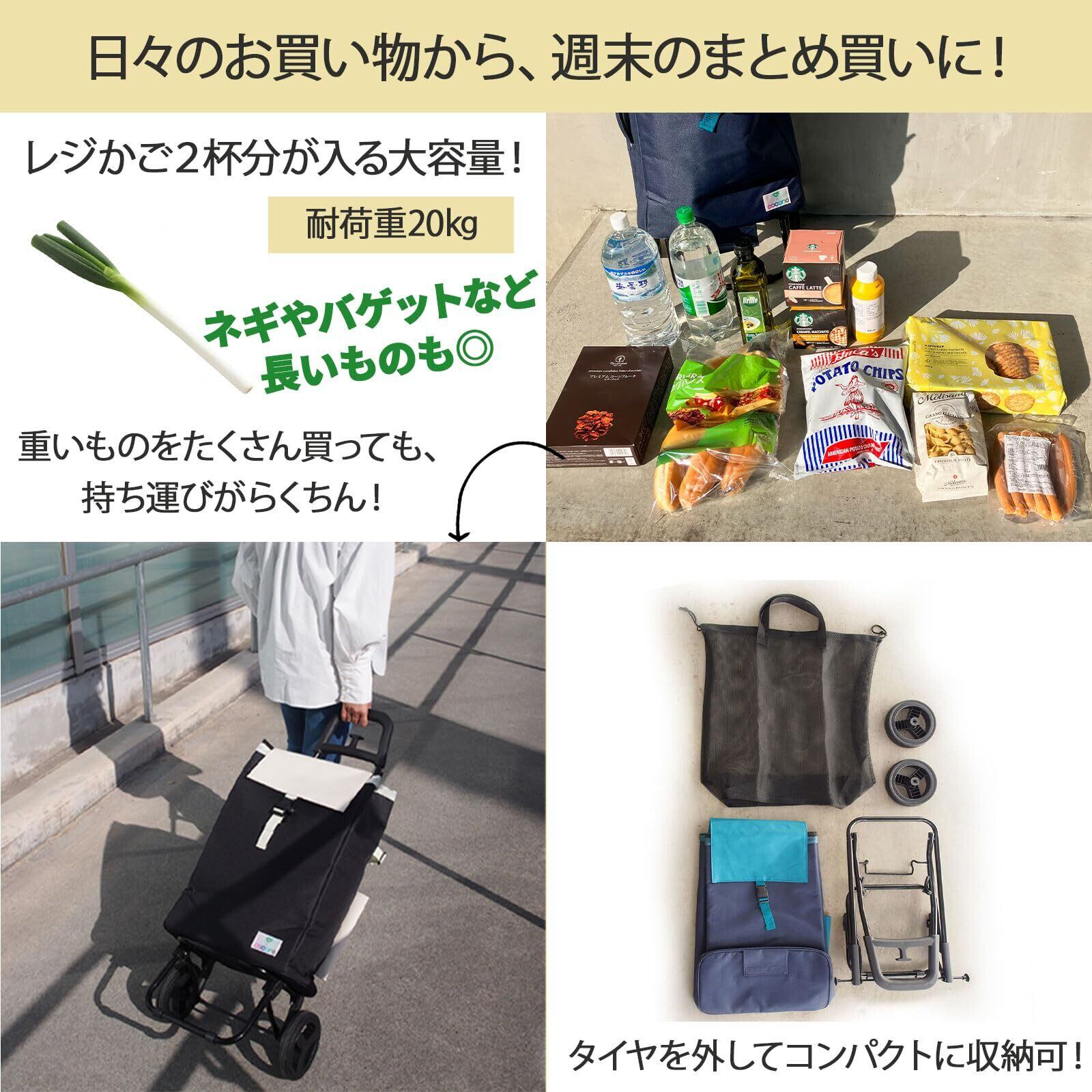 [ウェルファン] COCORO(コ・コロ) ショッピングカート メッシュバッグ付 容量40L ネイビー ターコイズ 保冷 保温 折りたたみ式 レジかご対応 大型タイヤ付き 買い物カート 40代 50代 向け プレゼント