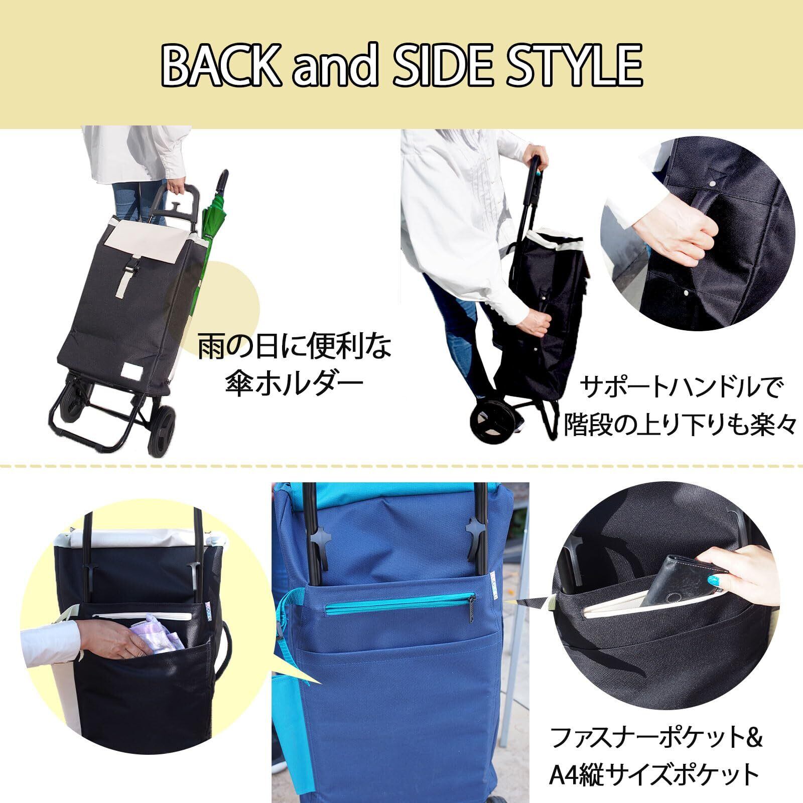 【使いやすさを考えた便利機能】 折りたたみ式・手荷物フック・傘ホルダー・ファスナーポケット・サイドハンドル付き。スーパーのカートにセット可能。お買い物中も邪魔にならない。
