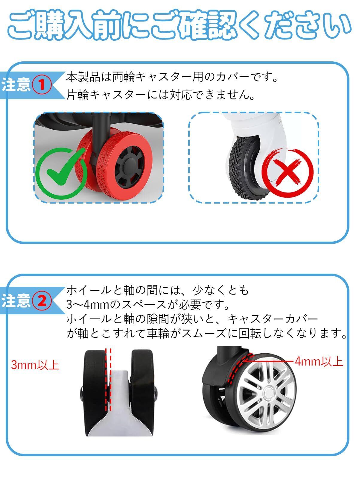【脱落防止&広範な互換性】このタイヤカバーはS、M、Lの3つのサイズがあり、さまざまな車輪に対応可能です。Sサイズは直径47~52mm、Mサイズは直径52~58mm、Lサイズは58~65mmの車輪に適しています。従来のシングルサイズに比べ、当店のサイズ選択は豊富で、車輪によりフィットする、外れにくい。さらに、車輪カバーの側面幅に拡大し、包み込む面積を増やすことで、キャスターカバーの脱落を効果的に防止します。