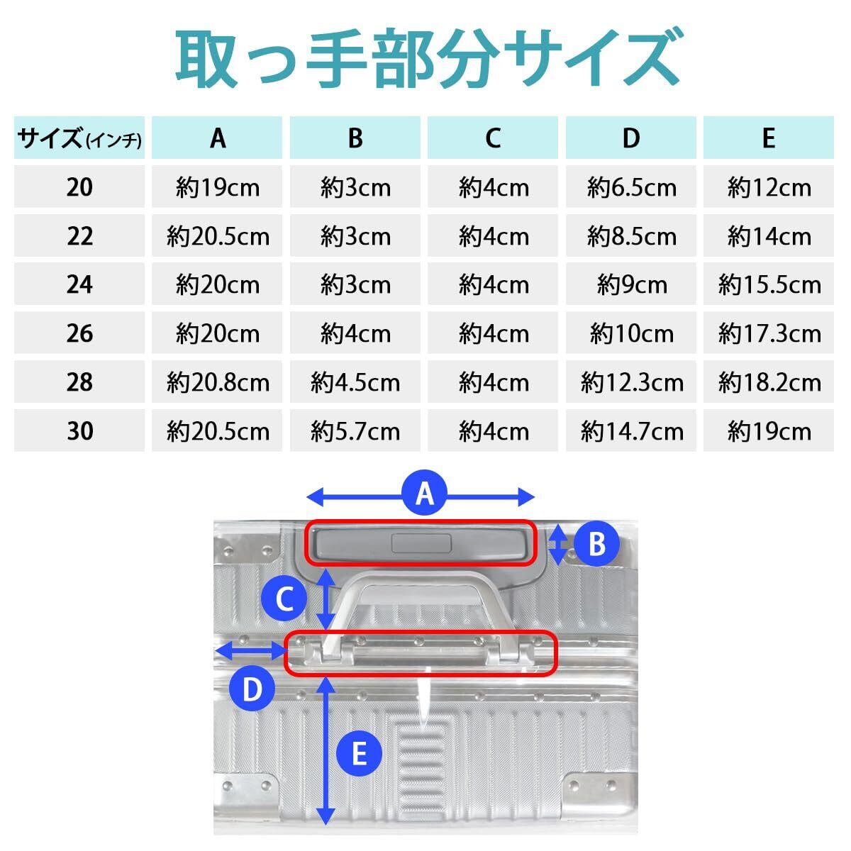 【適応サイズ】 下記に記載のサイズは、キャスターを除いたスーツケース本体の寸法となります 20インチ 約50×36×22 22インチ 約55×40×24 24インチ 約60×42×26.5 26インチ 約65×45×28 28インチ 約70×49×29 30インチ 約75×56×35