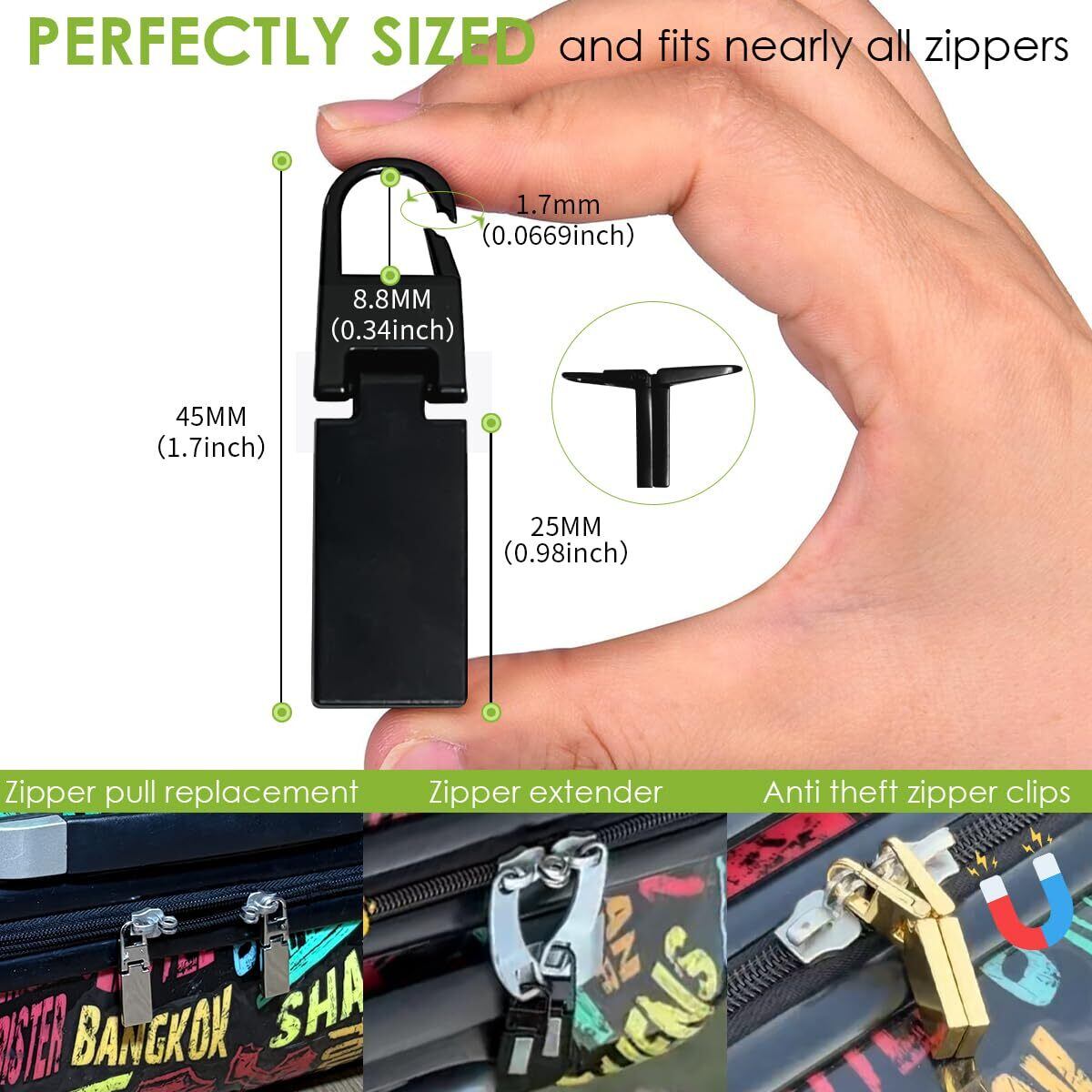 クリップで留めるだけで、すぐに安全に取り付けられます。ジッパープル交換の場合、持ちやすくジッパーが簡単で、荷物にジッパープルがない場合の完璧なソリューション