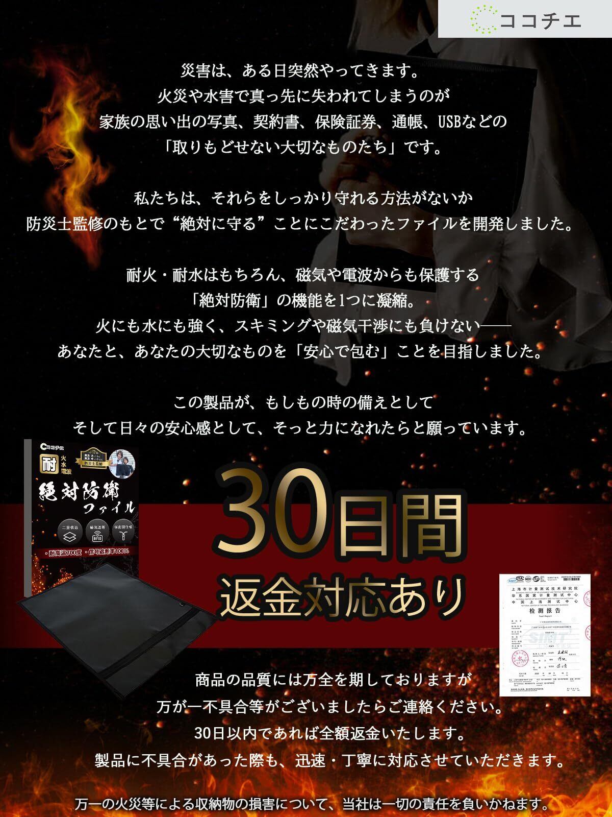 【在庫処分】耐火バッグ 防災 家族用 書類保管ケース 防火 防水 電波遮断 3重防御 通帳 証券 貴重品 収納ファイル A4対応 持ち出し用 ココチエ 絶対防衛ファイル