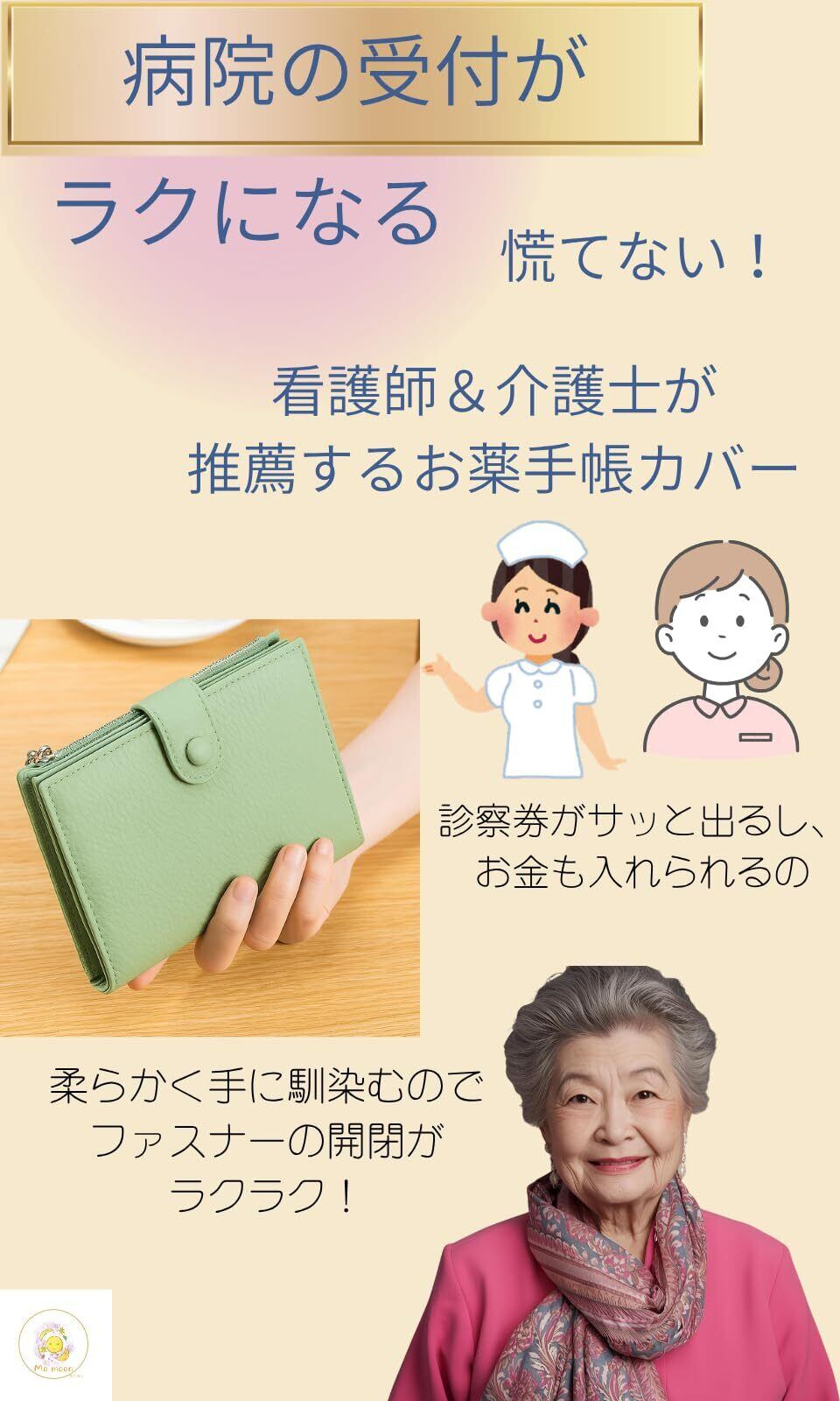 やさしいピンク、さわやかなグリーン、上品なブラック。 どの色も手になじみやすく、病院や外出先でも品よく持てるお薬手帳カバーです。 もともとは「パスポートケースとしても人気の多機能デザイン」で作られているため、 お薬手帳はもちろん、保険証・診察券・領収書・現金まで“ひとまとめ”に。 通院のたびに「どこに入れたかな?」と探す時間をぐっと減らし、忙しい毎日をしっかりサポートします。 ファスナー付きで中身が落ちにくく、しっかり開いて見やすい仕様だから、受付でも慌てません。 大切な情報を1冊にまとめられる安心感があり、親御さまへのプレゼントにも最適です。 通院ポーチとして、旅行時の貴重品ケースとして、長くお使いいただける信頼の一冊です。