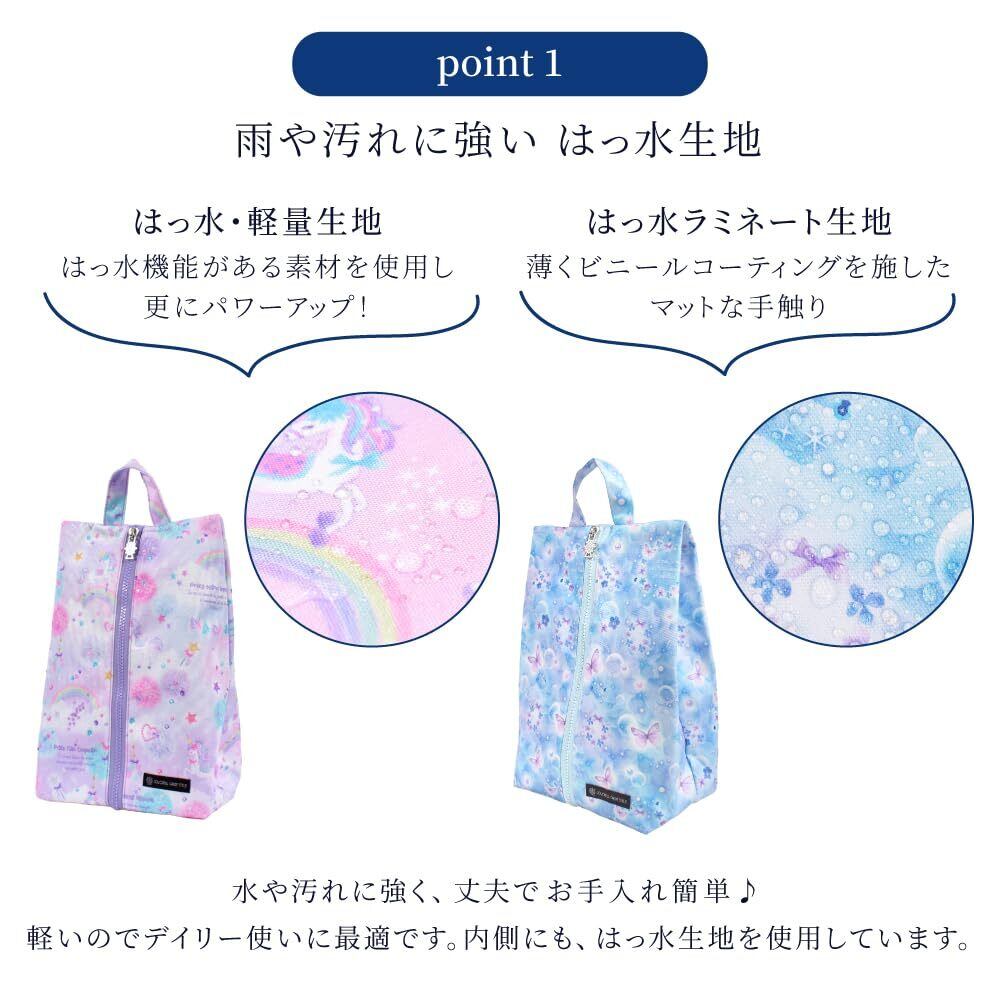 高学年まで使える余裕のサイズ感。ファスナー付きで使いやすく、習い事のシューズケースにもぴったり! 。24.5cm程度のスニーカーまで収納できます(自社調べ)。上履きだけでなくサッカーシューズ入れなどにもおすすめ。ファスナーで大きく開くので園児や低学年でも出し入れしやすく、雨や雪の日でも上履きを水濡れから守ります。自分でお仕度する練習にも最適。「自分でできる」喜びで自己肯定感を高めます。