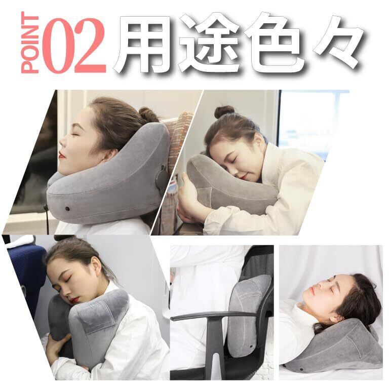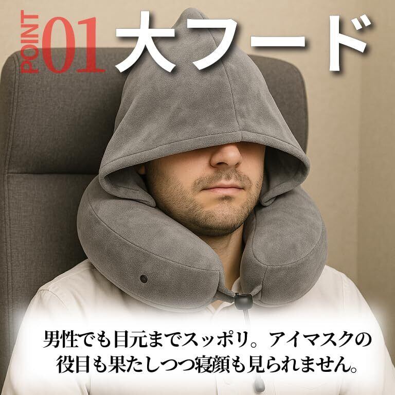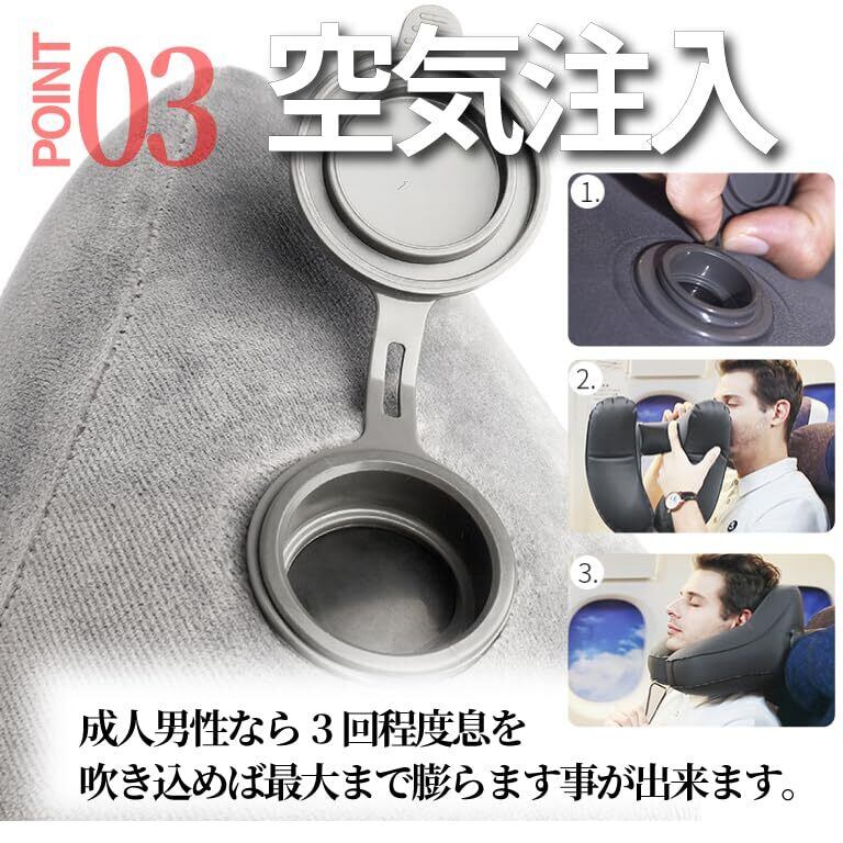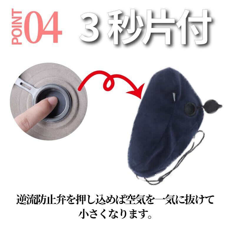 旅行やキャンプ、車中泊に大活躍! 大きなフード付きネックピローが新登場! 特大フードは、すっぽり目元まで隠してくれるので簡易のアイマスクの代わりにもなります。 さらに寝顔も隠せるのでプライバシー対策も◎ 使う時に空気口から息を吹き込むだけで簡単設置完了。 成人男性なら3〜4回でぱんぱんに膨らみます。 使わない時は逆流防止弁を押し込むだけで、一気に空気が抜けてコンパクトに! 畳んで付属の収納袋に入れれば簡単コンパクトに持ち運び可能で邪魔になりません。 ベロア調のきもちいい手触りでぐっすりお休みになれます さらに汚れたらカバーを取り外してそのまま洗えて衛生的。 当店別売りのフットレストの空気入れも併用可能です。ぜひ一緒にお買い求めくださいませ。 ■内容 ネックピロー本体*1 フード*1(有無が選べます) 収納袋*1 ■カラー グレー/ネイビー/ブラック ■素材 カバー:PVC 中素材:ポリ塩化ビニール ■重さ 約260g(フード込) ※フードは有と無があります。 ※カバーを外す際は空気を抜いてチャックを開けてください。