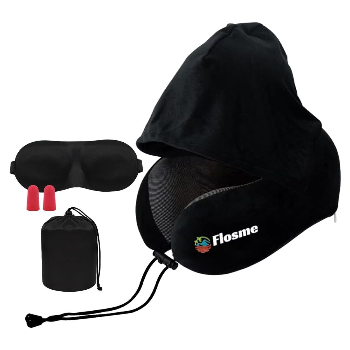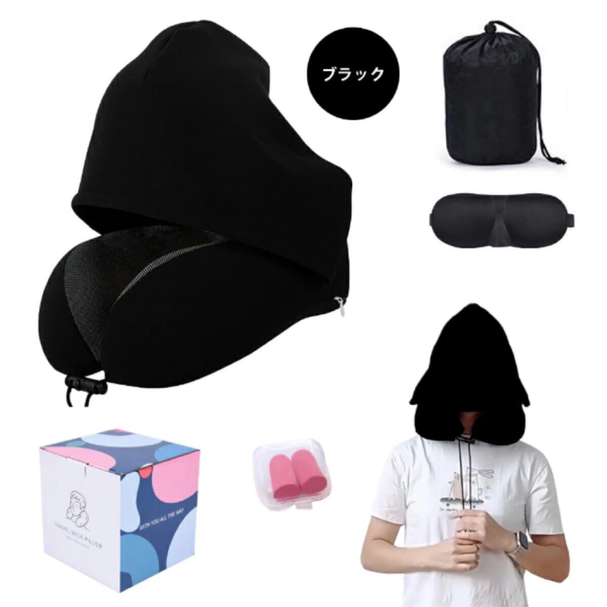 【新着商品】ネックピロー 飛行機 旅行 低反発 首枕 携帯枕 フード付きネックピロー 携帯 顔を隠す 首が痛くならない トラベル枕 U首まくら クッションカバーアイマスク 耳栓 収納袋 洗える 車 新幹線 ソファ 椅子 お昼寝 便利グッズ 快眠 仮眠 人気 自宅 旅行 プレゼント-ブラック