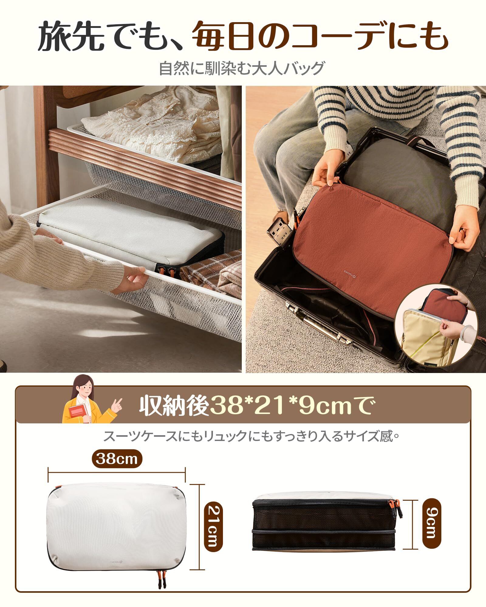【1〜2泊用 コンパクト・大容量】旅行用圧縮袋として便利なサイズ(約38×21×9cm)で、スーツケースやクローゼットにもすっきり収納。冬は1泊分、春秋は2泊分の衣類をまとめて管理できます。コンパートメント設計により仕分けしやすく、シワもつきにくい仕様。軽量で持ち運びやすく、出張や週末旅行まで幅広く活躍します。