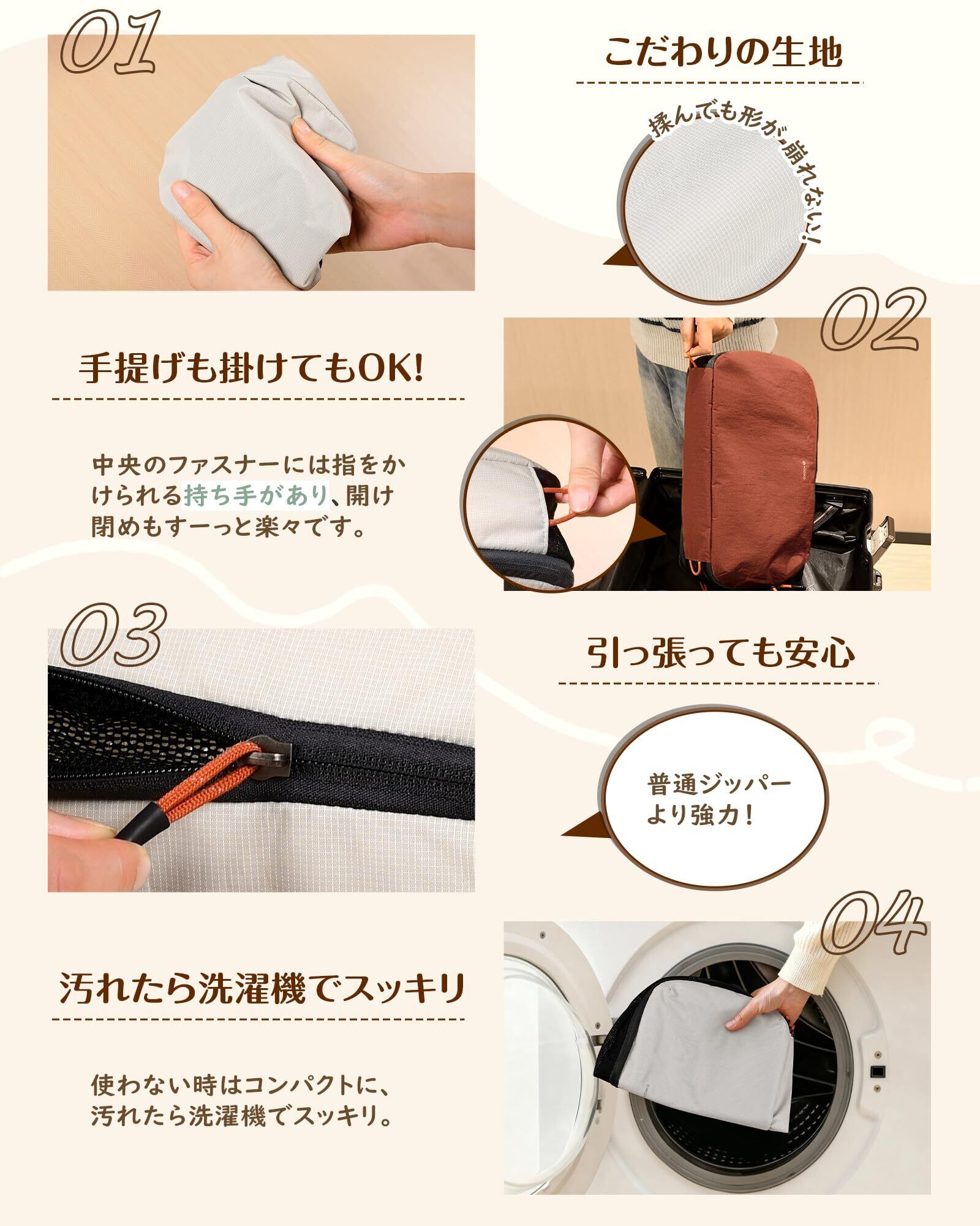 【圧縮ポーチ 約30%省スペース】衣類をすっきりまとめられるトラベルポーチです。メインポケットで衣類を、内側のメッシュポケットで小物を整理可能。収納ファスナー→圧縮ファスナーの順に閉めるだけで、かさばる衣類が瞬時にスリムに。荷物を約30%節約でき、スーツケース内をより広く使えます。