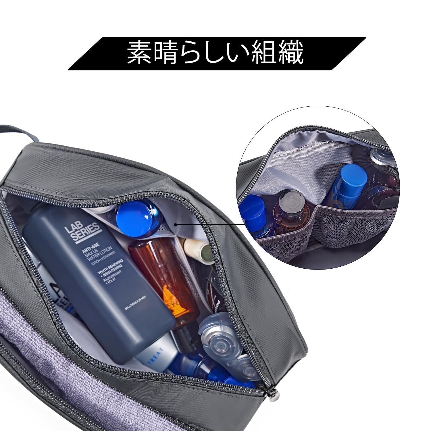 【ポケット付き】トイレタリーバッグの内側にはメッシュポケットが2つあり、物が散らかるのを防ぎ、小物を整理するのに便利です。