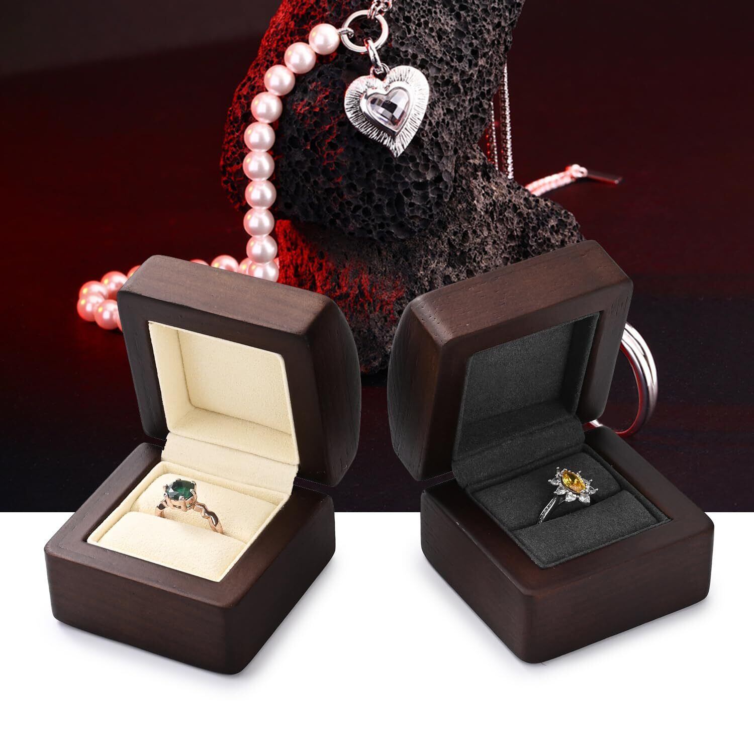 【ウォールナットの温もりと高級感】ウォールナット製の指輪 箱は、高級天然木材を使用しており、自然の温かみと美しい木目が魅力です。指輪を挟む部分には高密度マイクロファイバーに包まれて、手触りも滑らかで、ジュエリーを傷つける心配がありません。木材の堅牢性も高く、長期間にわたりその美しさと機能性を保ちます。シンプルなデザインは、どんなインテリアにもマッチしやすく、洗練された雰囲気を醸し出します。