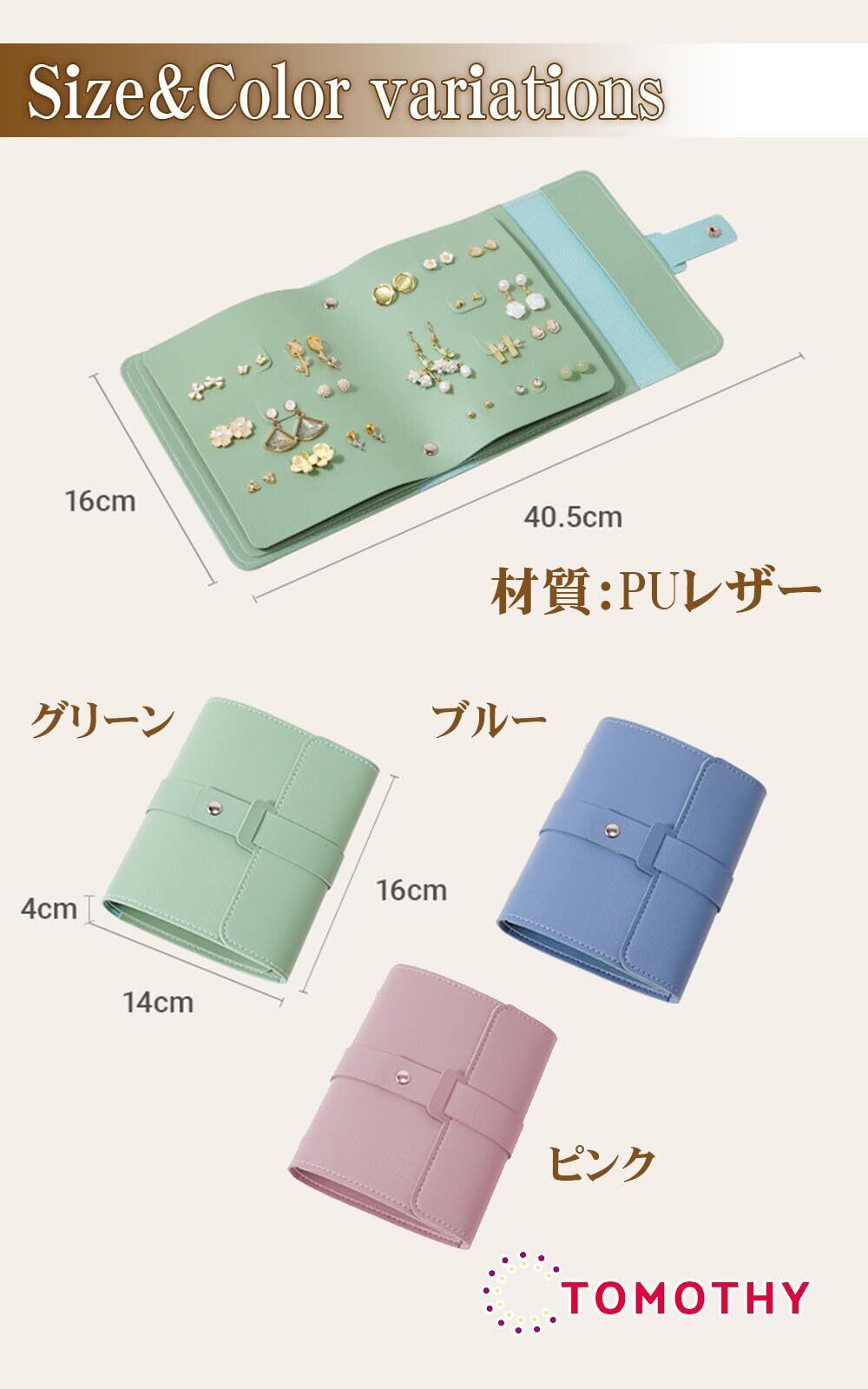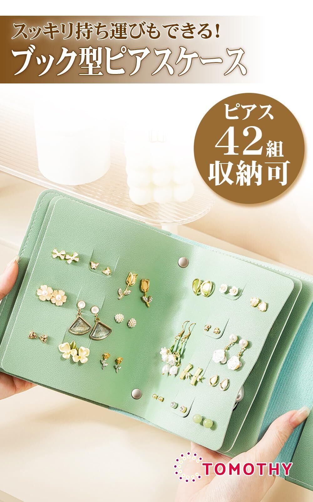 TOMOTHYのブック型ピアス収納ケースはスタイリッシュで機能的なデザインを兼ね備え42組のピアスをコンパクトに収納できる優れものです。 ピアスを効率よく整理整頓し場所を取らずに美しくディスプレイすることができます。 【コンパクトな収納力】 42組のピアス収納: このケースは42組のピアスを収納できるため多くのコレクションを一つの場所にまとめることが可能です。スペースを無駄にせず効率的にピアスを保管できます。 【ピアスの保護設計】 交互収納: ピアス同士が干渉しないように交互に配置できる設計になっており破損のリスクを最小限に抑えます。これにより大切なピアスを安全に保管できます。 【カラーバリエーション】 3色展開: ピンク、ブルー、グリーンの3色からお選びいただけます。お好みやインテリアに合わせてお選びいただけるカラーバリエーションが魅力です。 【多機能ポケット】 ブレスレットやヘアアクセサリーなどの小物も収納できるサイドポケットが付いています。これ一つで様々なアクセサリーを整理することができます。 【PUレザー素材】 水を弾くレザー素材で作られており「汚れにくく」「お手入れも簡単」 【軽量設計】 重さはわずか200g。軽量なので持ち運びにも便利です。旅行や出張時にも活躍します。 【使用シーン】 このブック型ピアス収納ケースは自宅での使用はもちろん、旅行や出張などの外出時にも便利です。コンパクトなデザインでありながら、大容量で多機能な収納力を備えているためどんなシーンでも大活躍します。 特に多くのピアスを持っている方や異なる種類のアクセサリーを一つにまとめたい方に最適です。