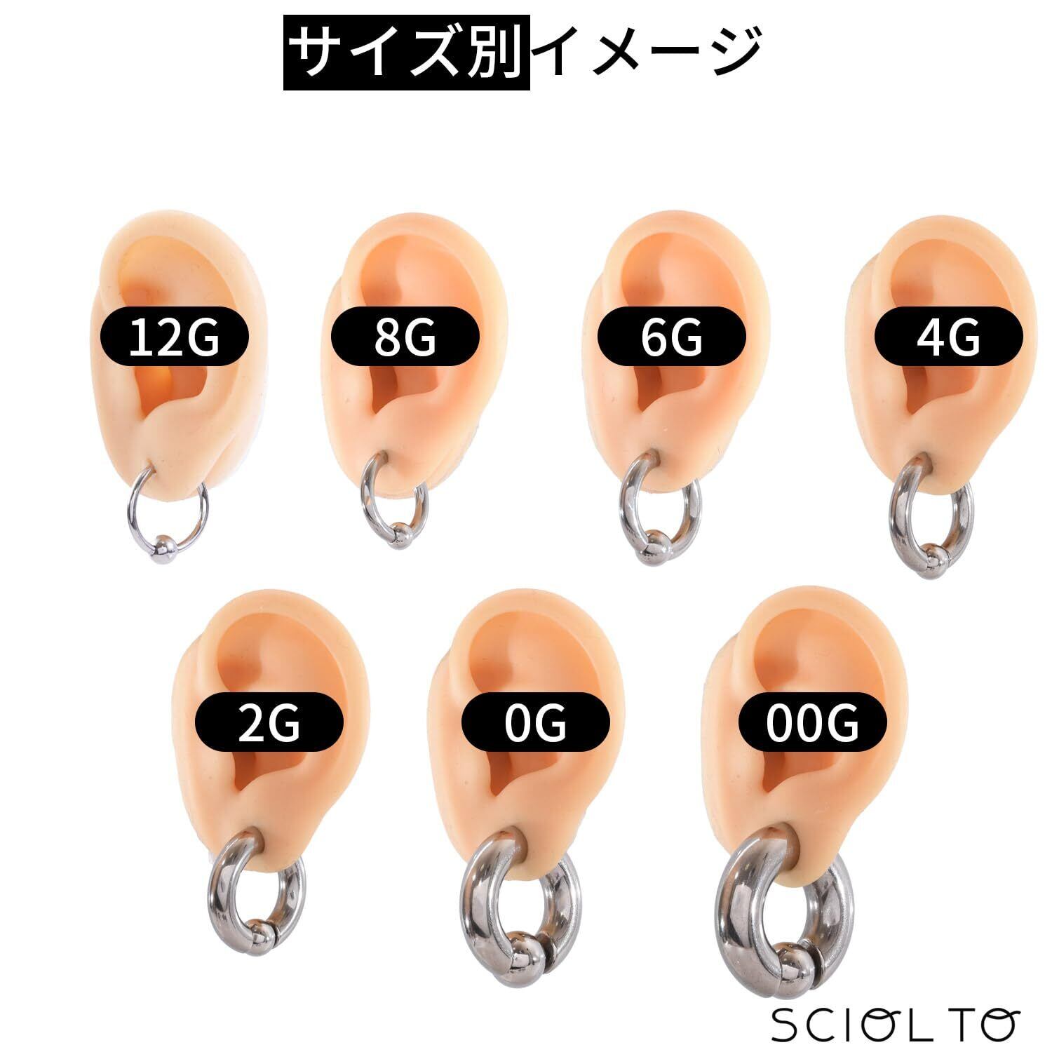 【サイズ】[12G](約3mm):外径20mm、内径16mm、重量約2g、ボールサイズ6mm [8G](約3mm):外径20mm、内径16mm、重量約3g、ボールサイズ6mm [6G](約4mm):外径24mm、内径16mm、重量約7g、ボールサイズ8mm [4G](約5mm):外径26mm、内径16mm、重量約10g、ボールサイズ8mm [2G](約6mm):外径28mm、内径16mm、重量約15g、ボールサイズ8mm [0G](約8mm):外径32mm、内径16mm、重量約32g、ボールサイズ12mm [00G](約10mm):外径36mm、内径16mm、重量約48g、ボールサイズ12mm