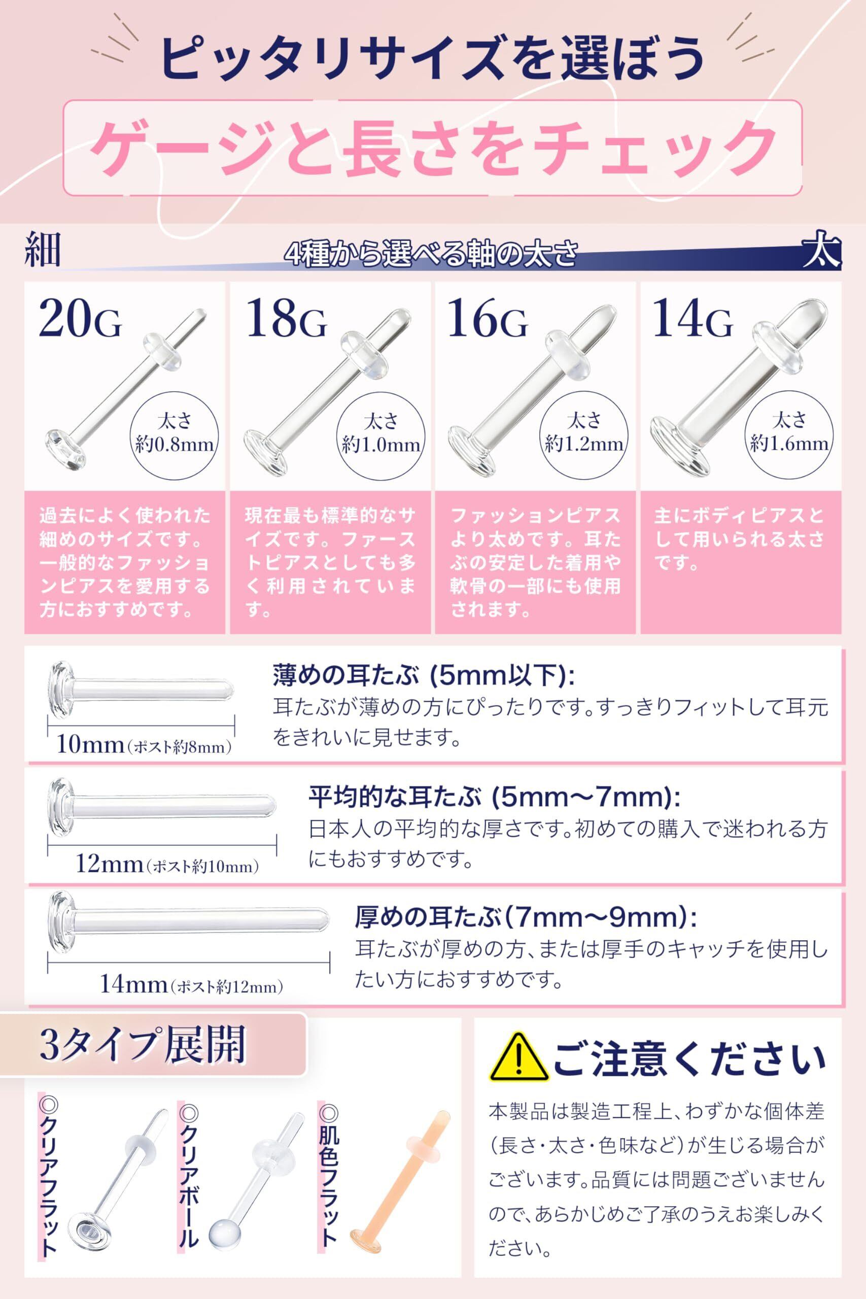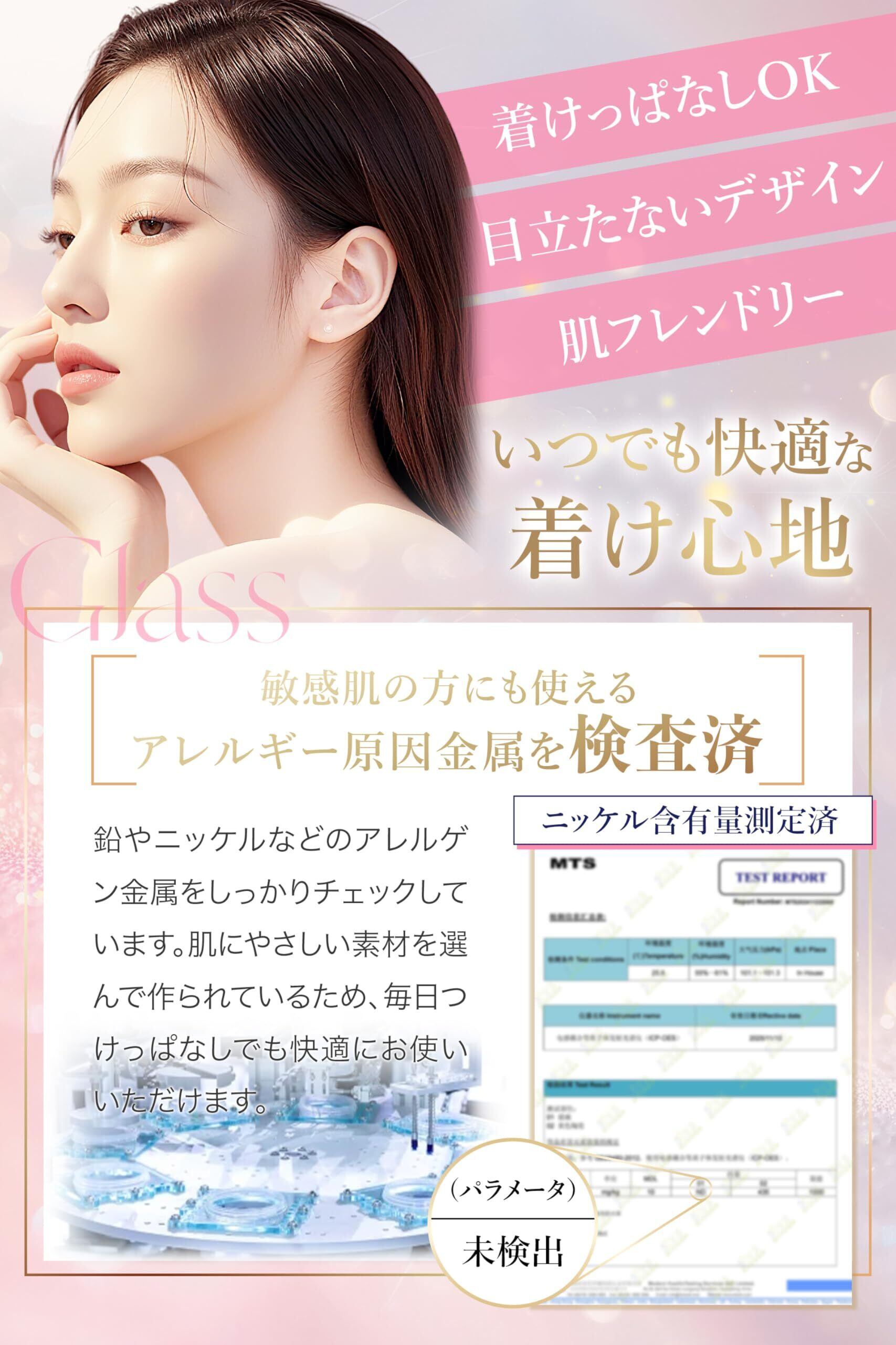 【抜群の透明度で目立たないデザイン】高透明ガラスならではのクリアさで、まるで着けていないかのような自然な印象を実現しました。オフィスや学校など、ピアスホールを目立たせたくない場面にも適しています。透明感のある仕上がりで、日常使いから特別なシーンまで幅広くお使いいただけます