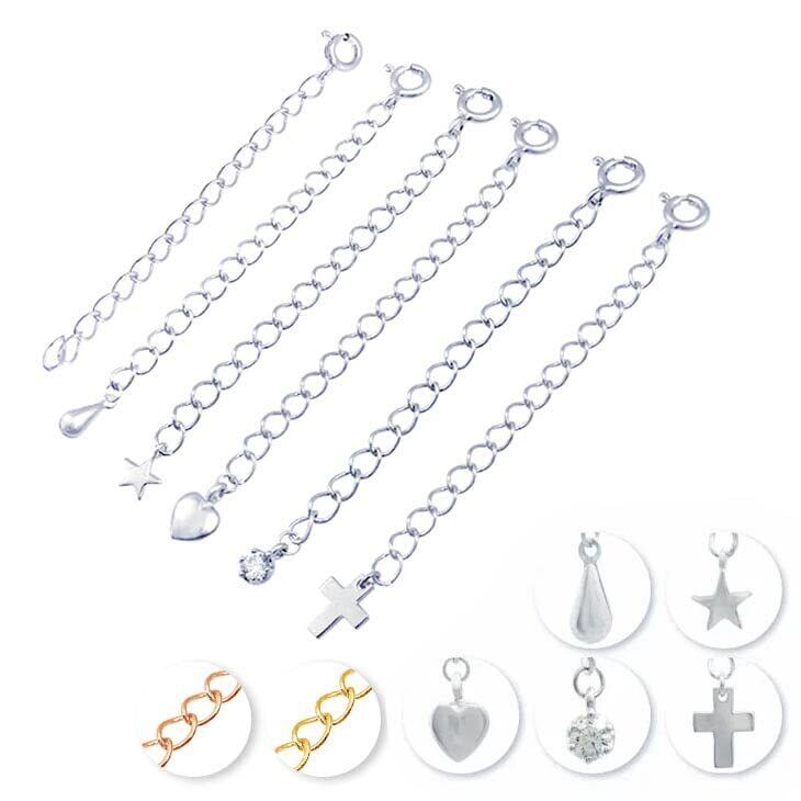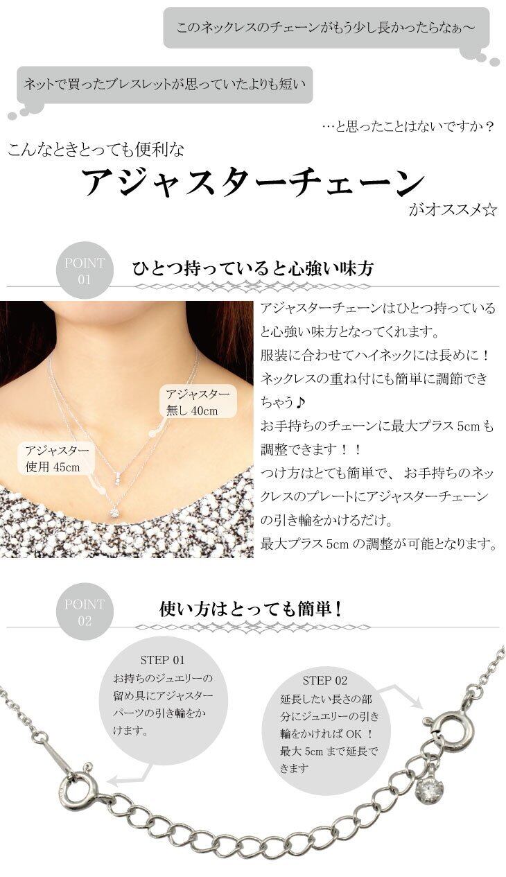 コレ1本でお洒落の幅が広がる、ネックレスチェーンアジャスター。お手持ちのネックレス・ブレスレット・アンクレットがもう少し長かったらなぁ~と思ったことはないですか? こんな時、とっても便利なアジャスターチェーンがおすすめです。アジャスターチェーンはひとつ持っていると心強い味方となってくれます。服装に合わせてハイネックには長めに、ネックレスの重ね付にも簡単に調節できちゃう。お手持ちのチェーンに最大プラス5cm調整できます。つけ方はとても簡単でお手持ちのネックレスのプレートにアジャスターチェーンの引き輪をかけるだけで 最大プラス5cmの調整が可能となります。アジャスターのエンドパーツはドロップ、スター、ハート、一粒CZ、クロス、エンドパーツなしから選べるので日によってアレンジを変えても良いですね。