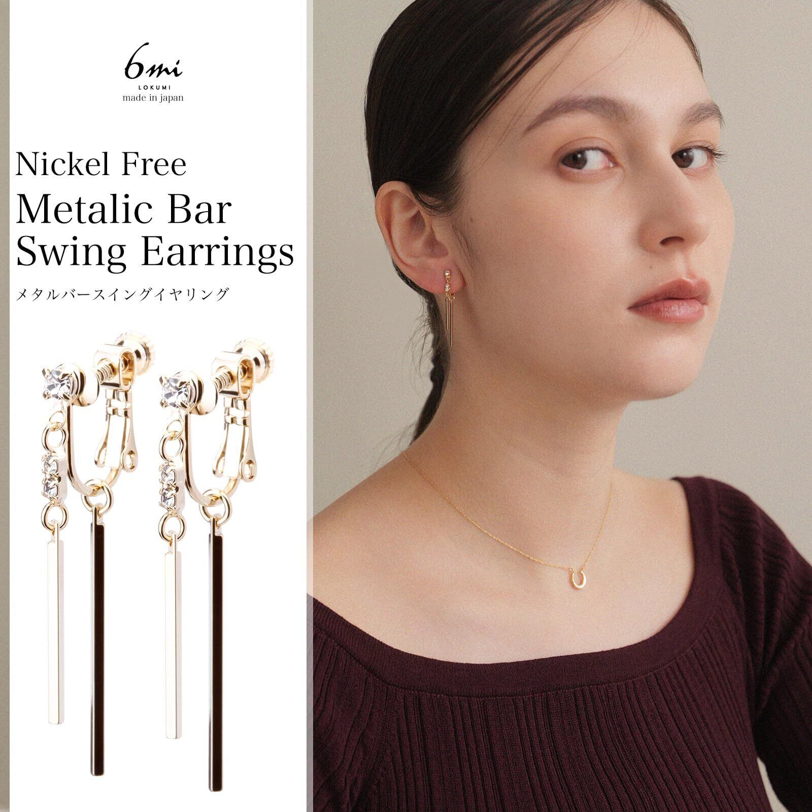 LOKUMI イヤリング 金属アレルギー対応 日本製 シリコンカバー付 バー ビジュー レディース シンプル 揺れる ロング シルバー ゴールド ピンクゴールド 金メッキ K24メッキ ネジ式 金属アレルギー対応イヤリング ne-68