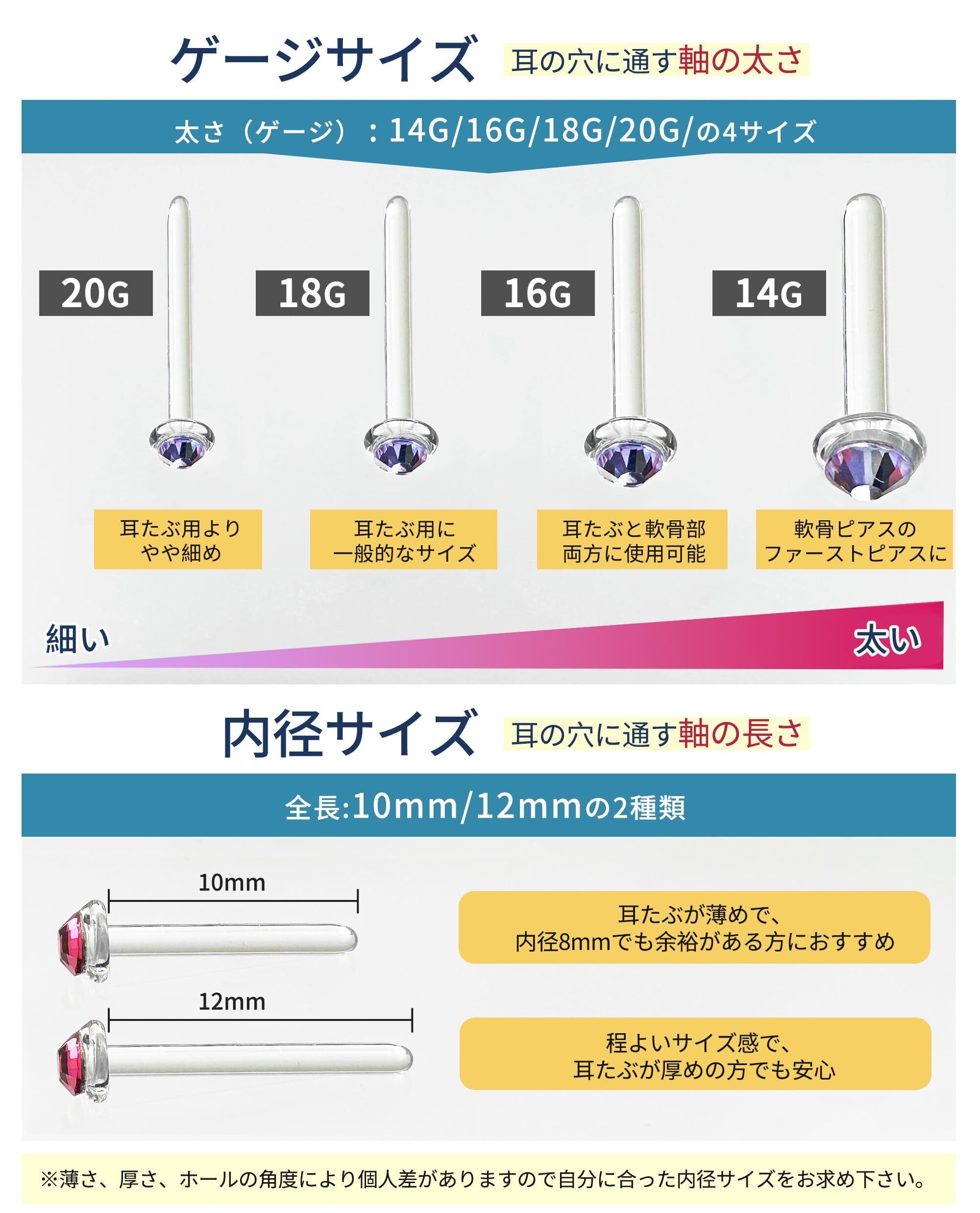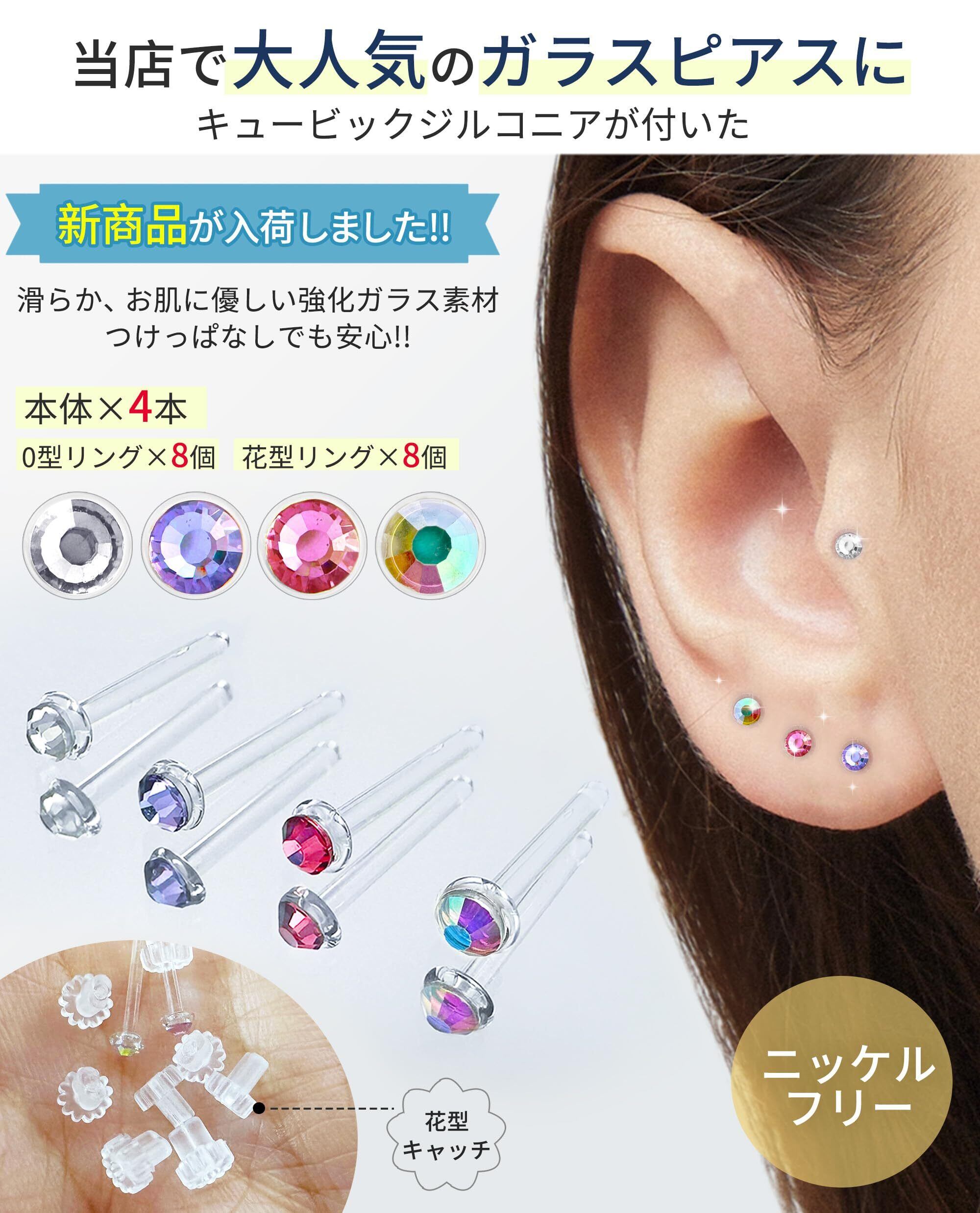 【つけっぱなしの新定番!!強化ガラス製ピアス】当店で大人気のガラスピアスにキュービックジルコニアが付いた新商品が入荷しました!! 内容:ガラス製ピアス4本 + シリコンキャッチ16本(リング型/花型) + 収納ケース1個 + オリジナルポーチ1個 ※軸長10mm/12mmの2種、ヘッド直径3.5mm、太さ(ゲージサイズ)は14G(1.6mm)/16G(1.2mm)/18G(1.0mm)/20G(0.8mm)の4サイズをご用意。耳たぶ、軟骨ピアスとして幅広くお使いいただけるスタンダードタイプです。