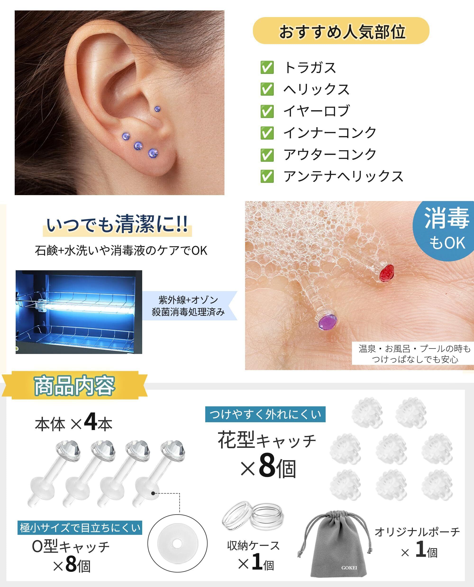 [GOKEI] ガラスピアス 透明ピアス 強化ガラス ピアス レディース 【4本ピアス+16個キャッチ】 14G 16G 18G 20G 金属アレルギー対応 軟骨ピアス ボディピアス つけっぱなし ガラス ピアッサー 透明 肌になじむ 軟骨 へそピアス キャッチ 両耳用